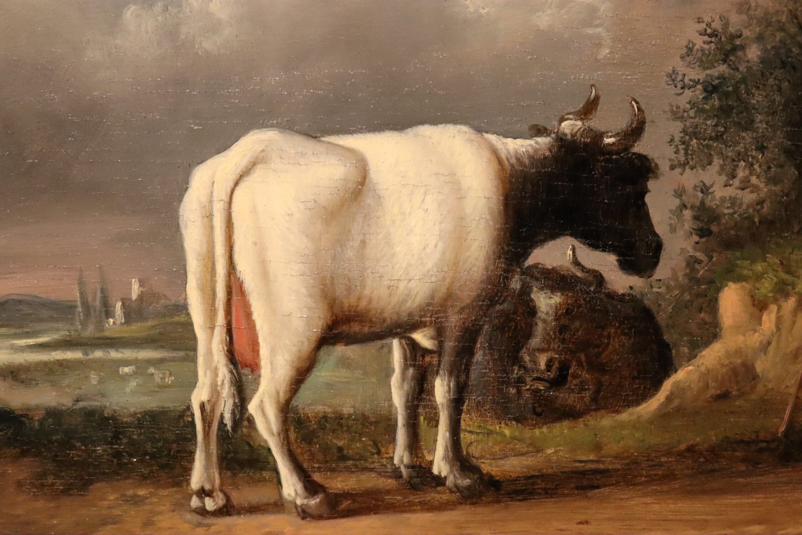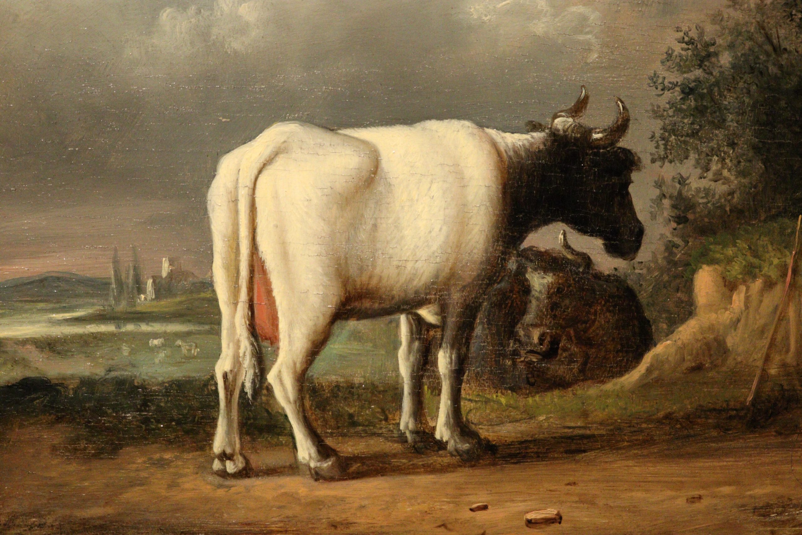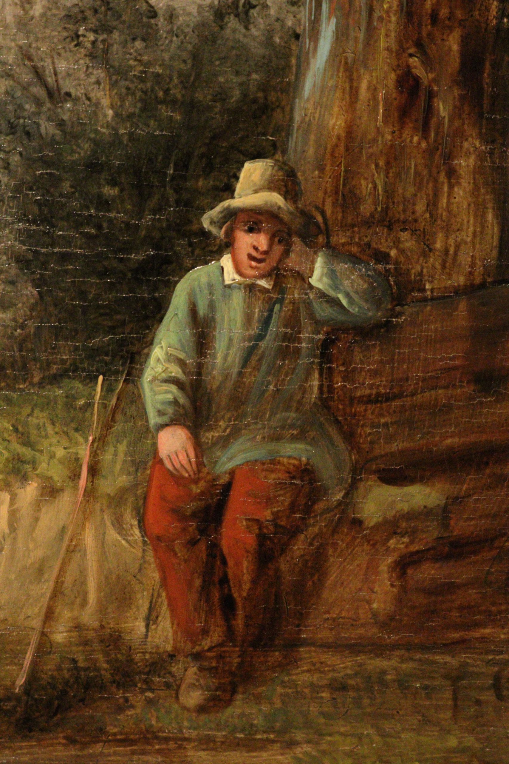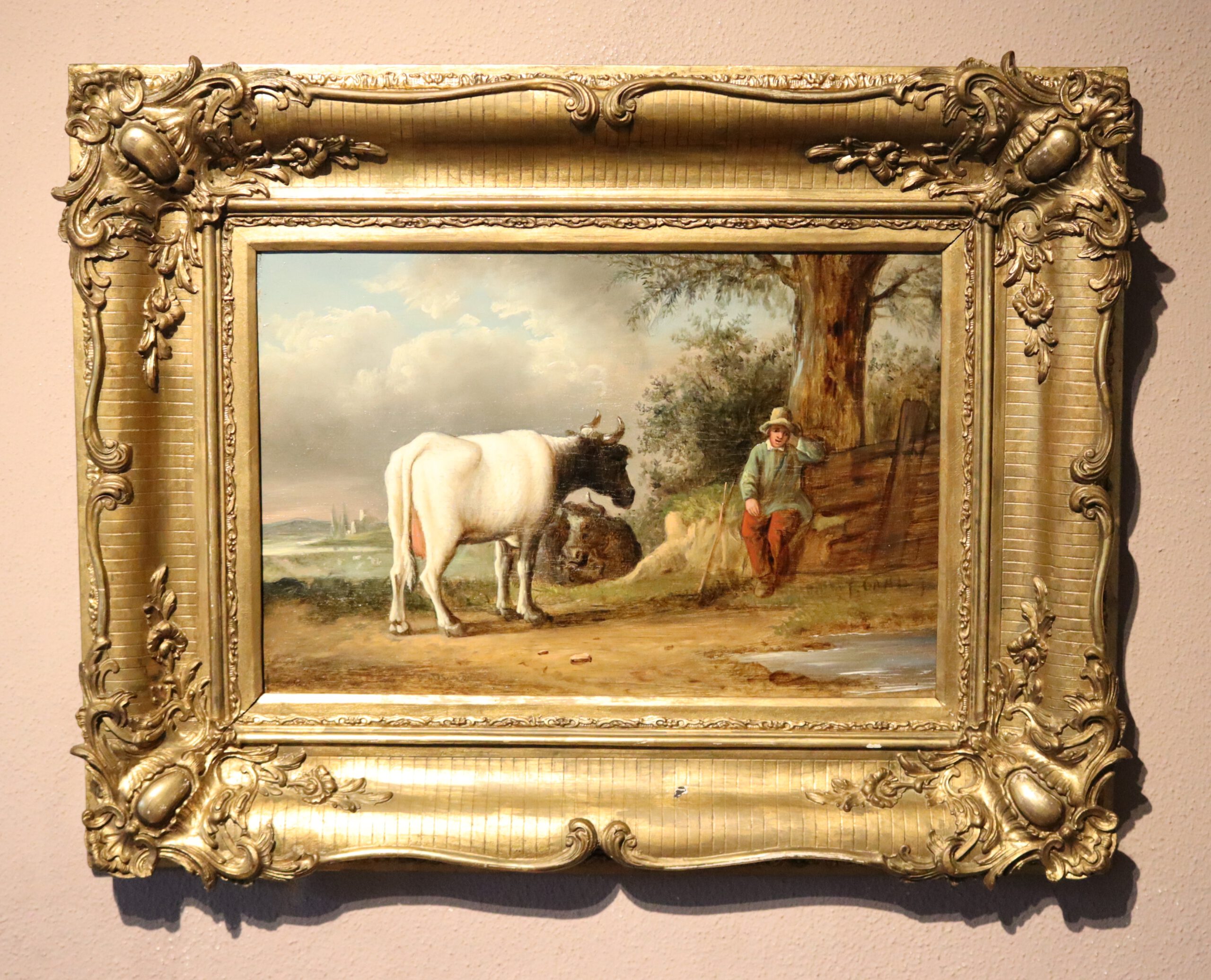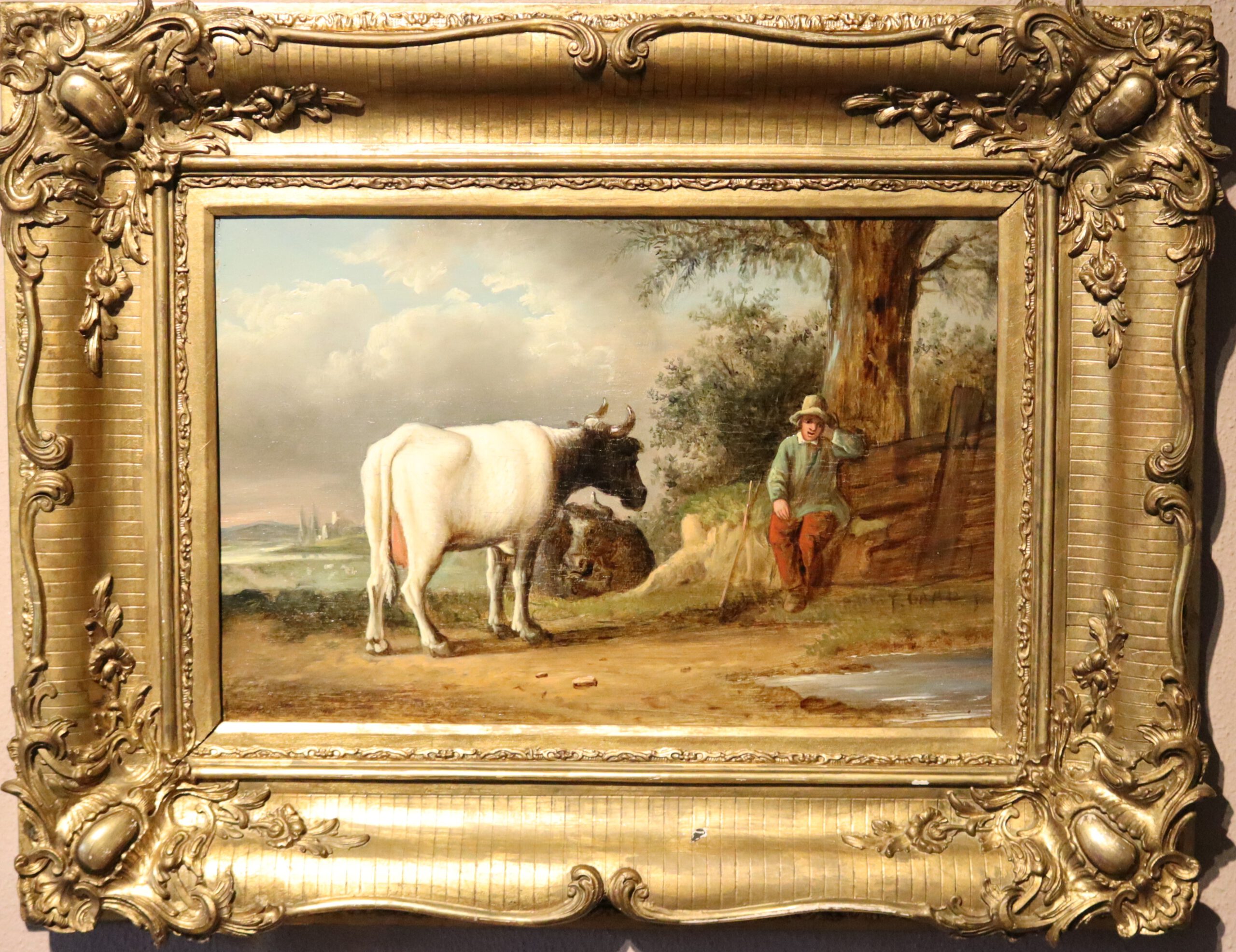 Fraai werk in olieverf op paneel voorstellende een landschap met koeien en een boer zittend bij een boom.