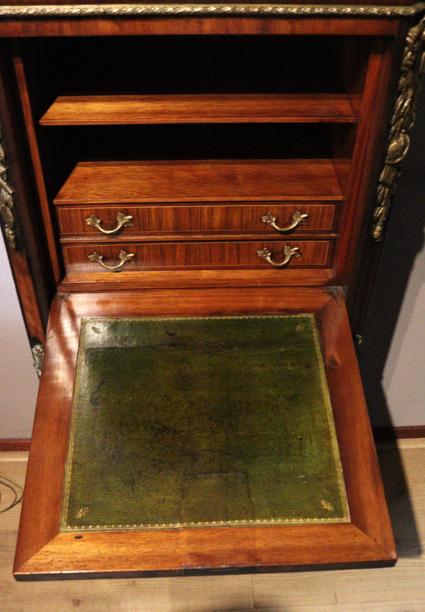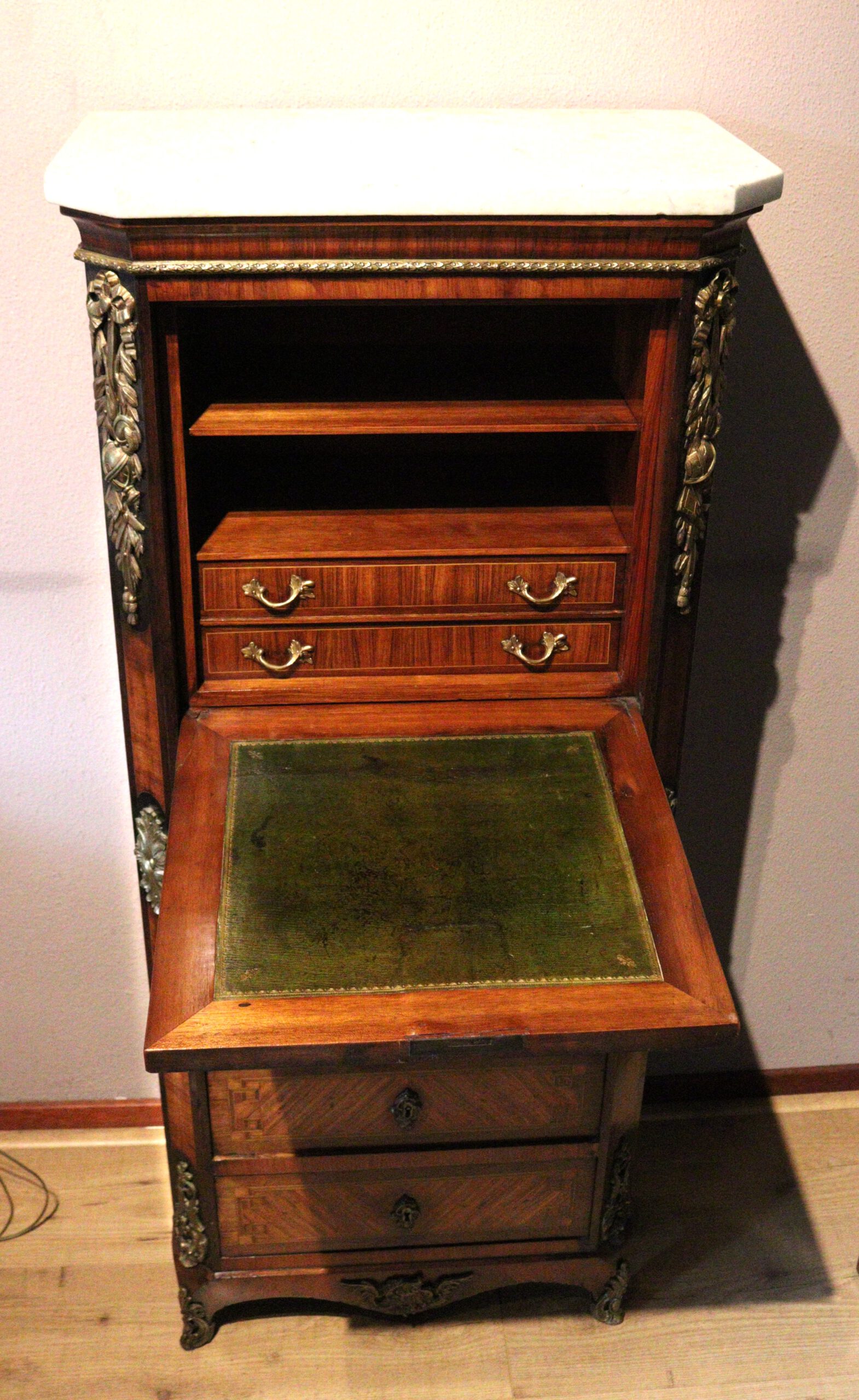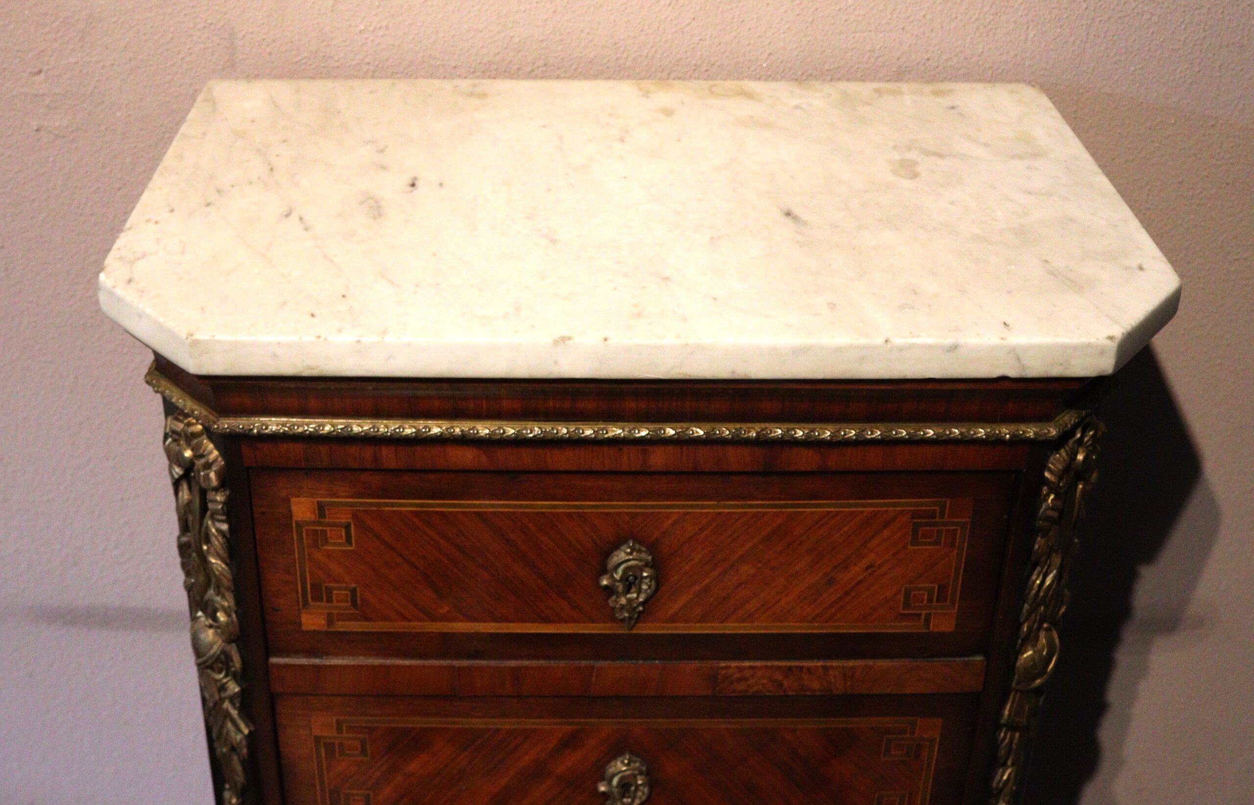 Het bovenblad is van wit marmer en het meubel is verder afgewerkt met bronzen sierornamenten.