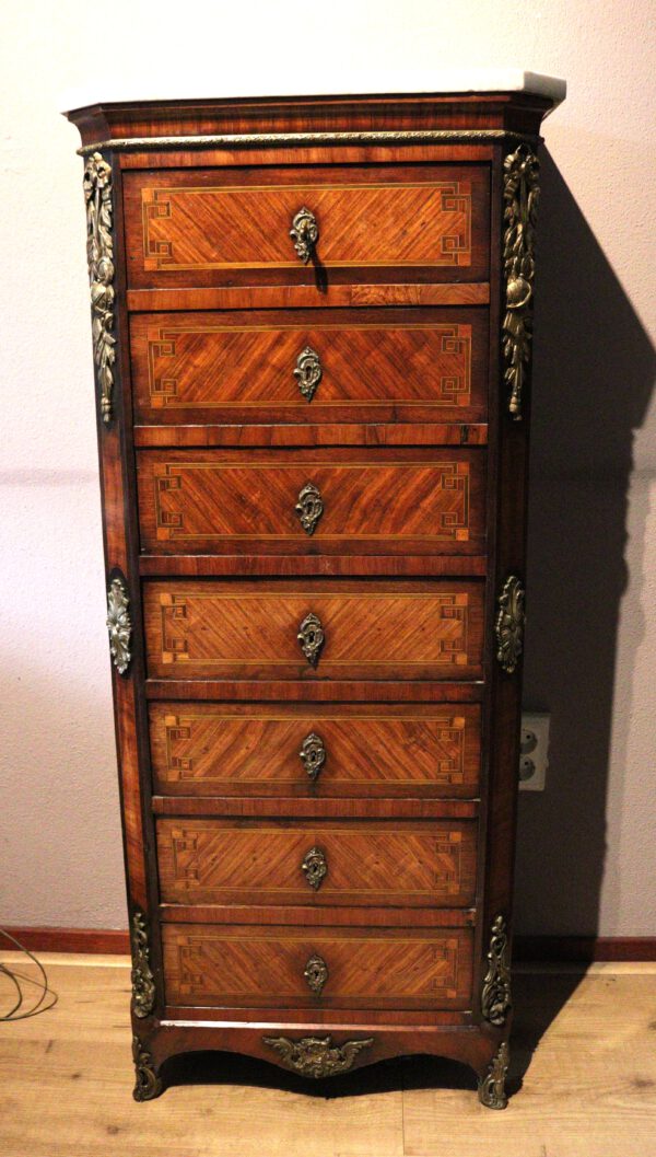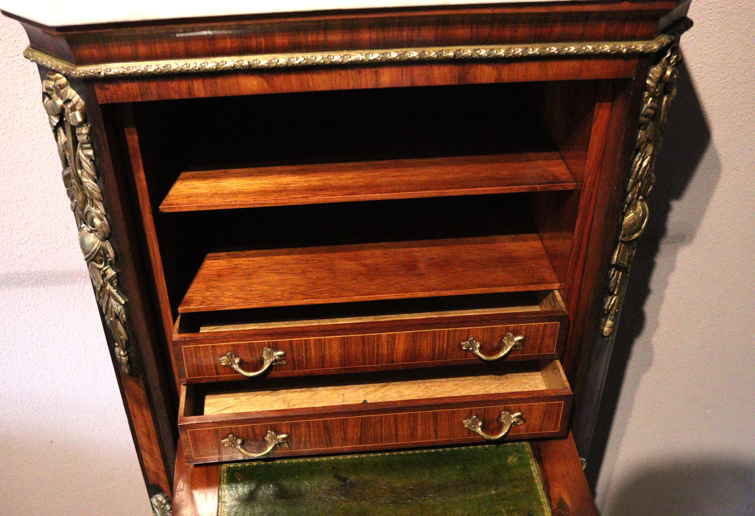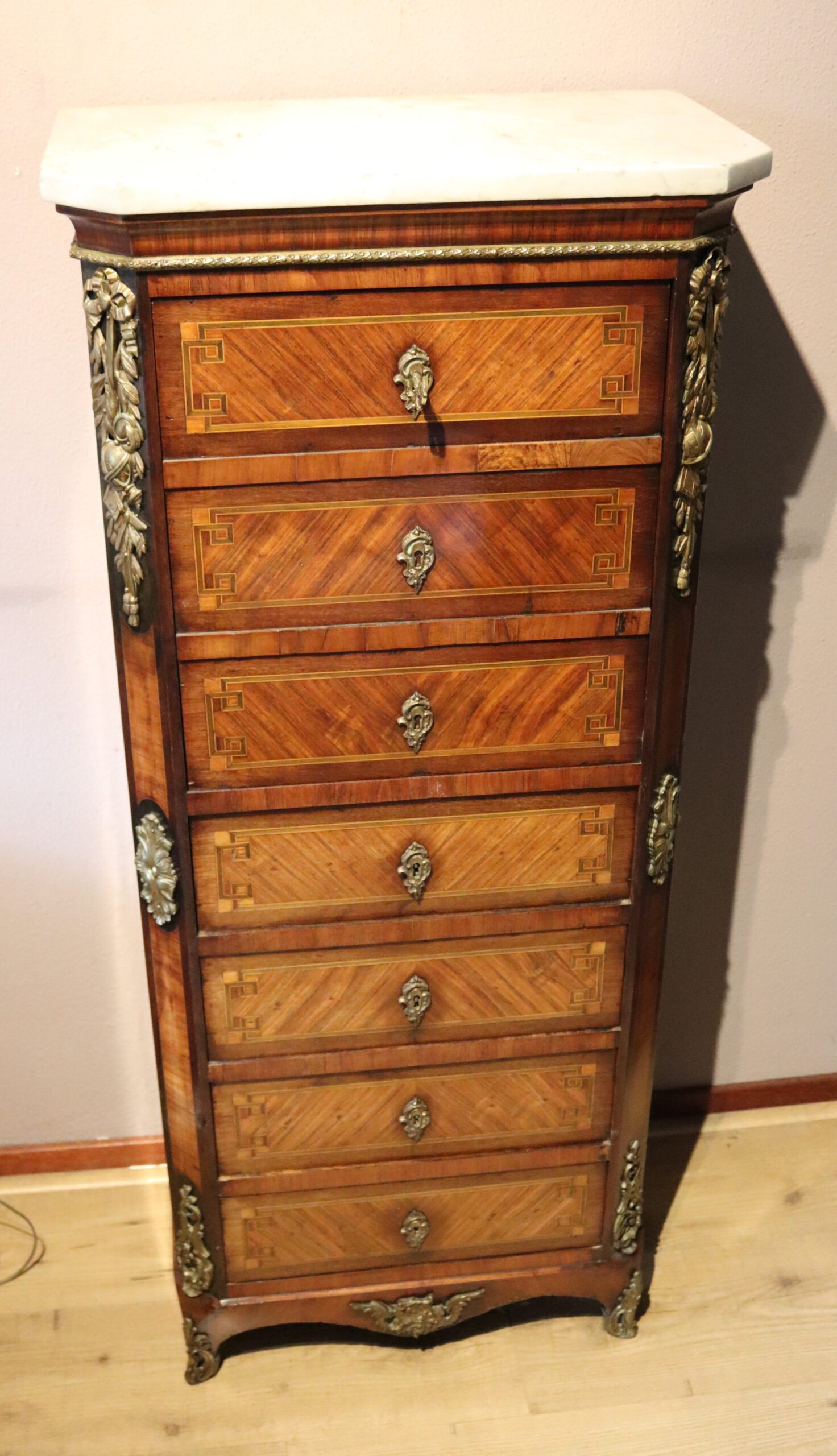 Het bovenblad is van wit marmer en het meubel is verder afgewerkt met bronzen sierornamenten.