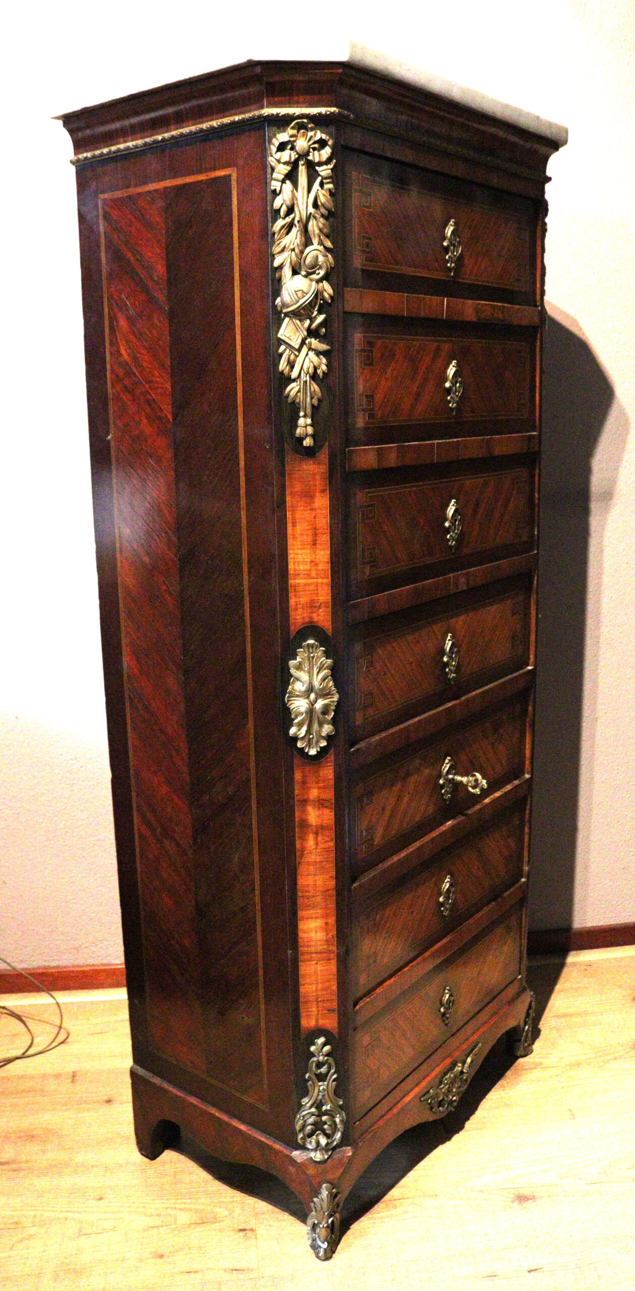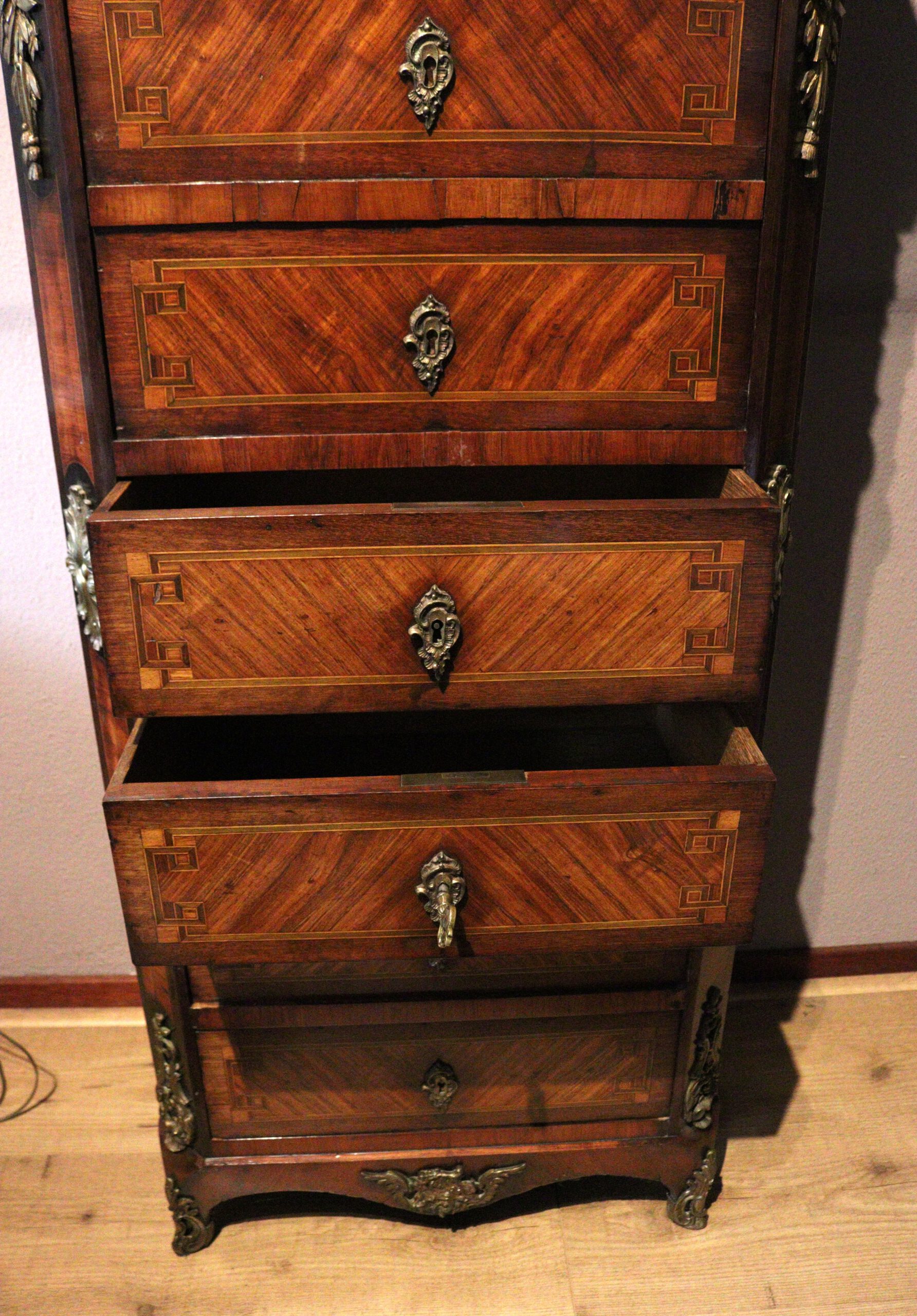 Zeer fraai antiek met intarsia ingelegd houten ladekastje met uitklapbaar bureaublad.