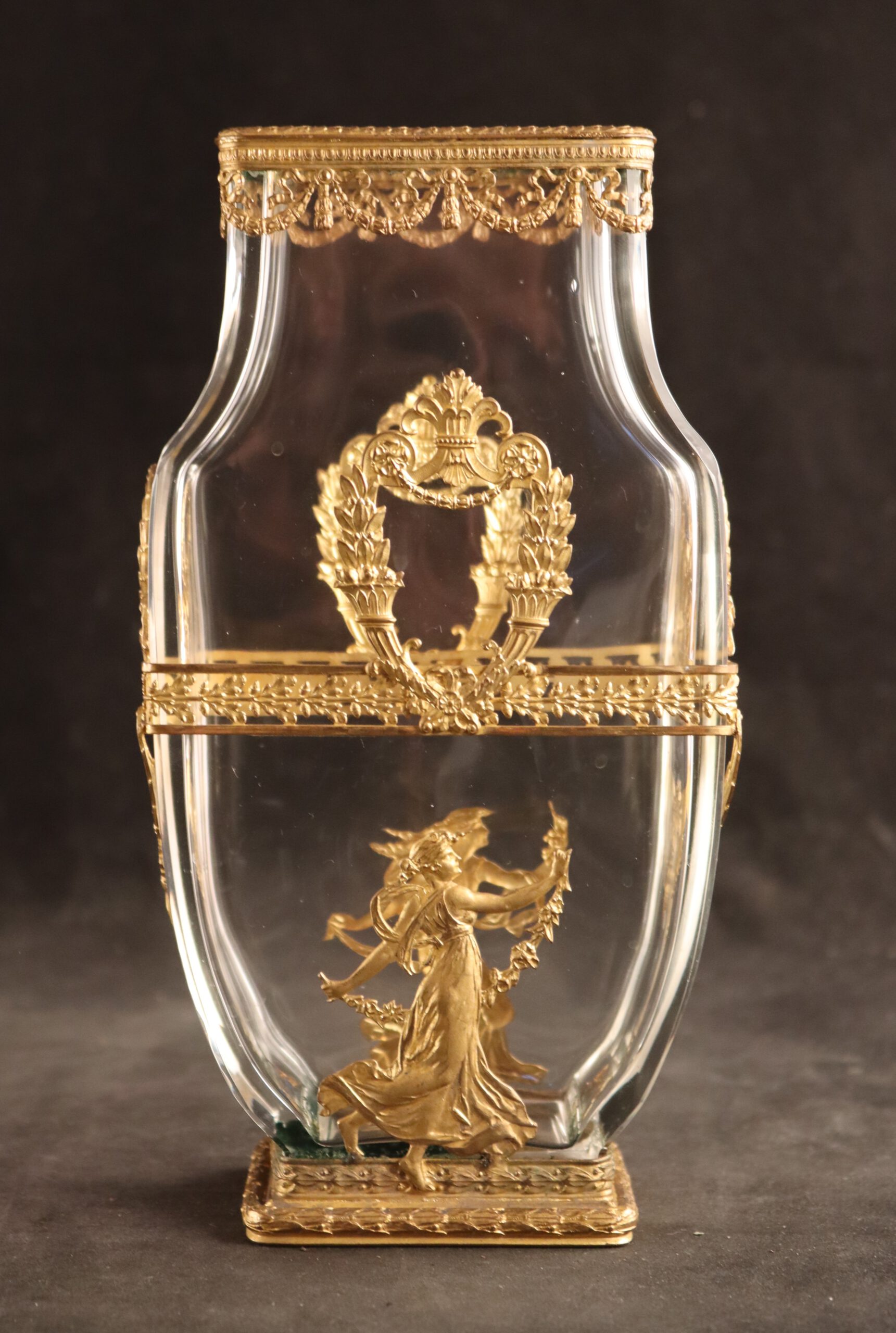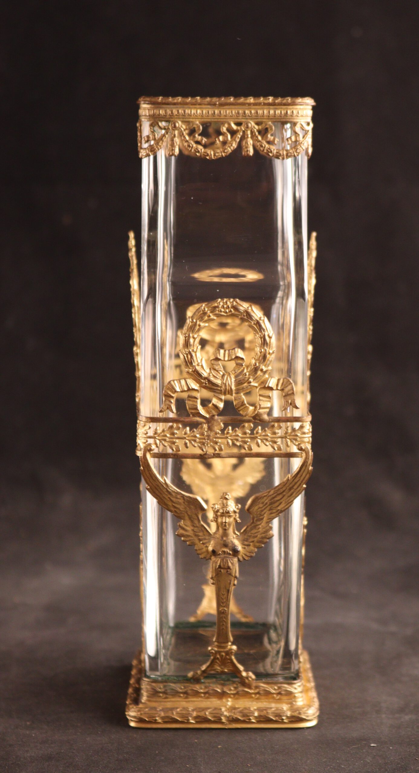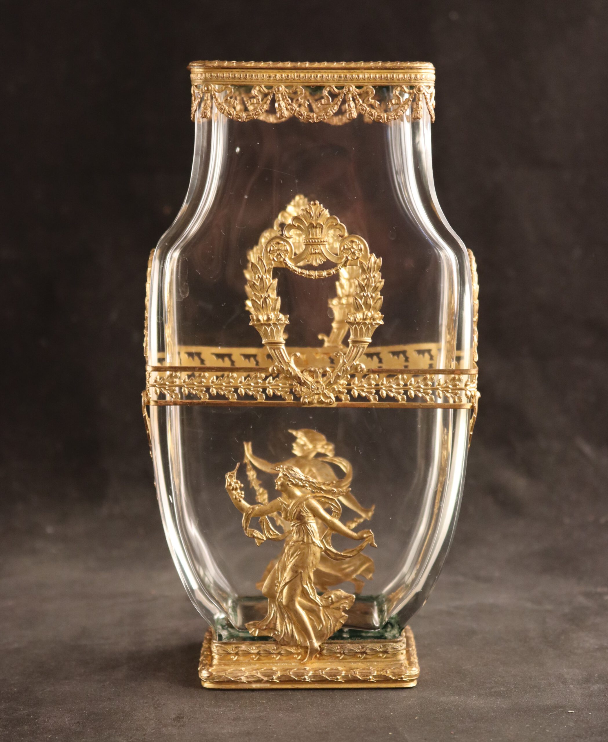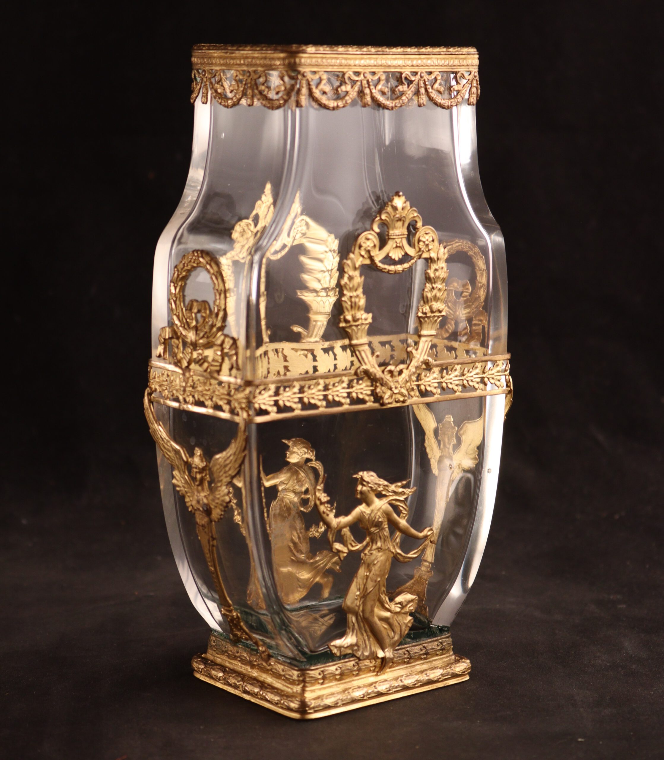 Zeer fraaie antieke kristallen Empire vaas die gevat zit een verguld bronzen montuur met versieringen en figuren uit de klassieke oudheid.