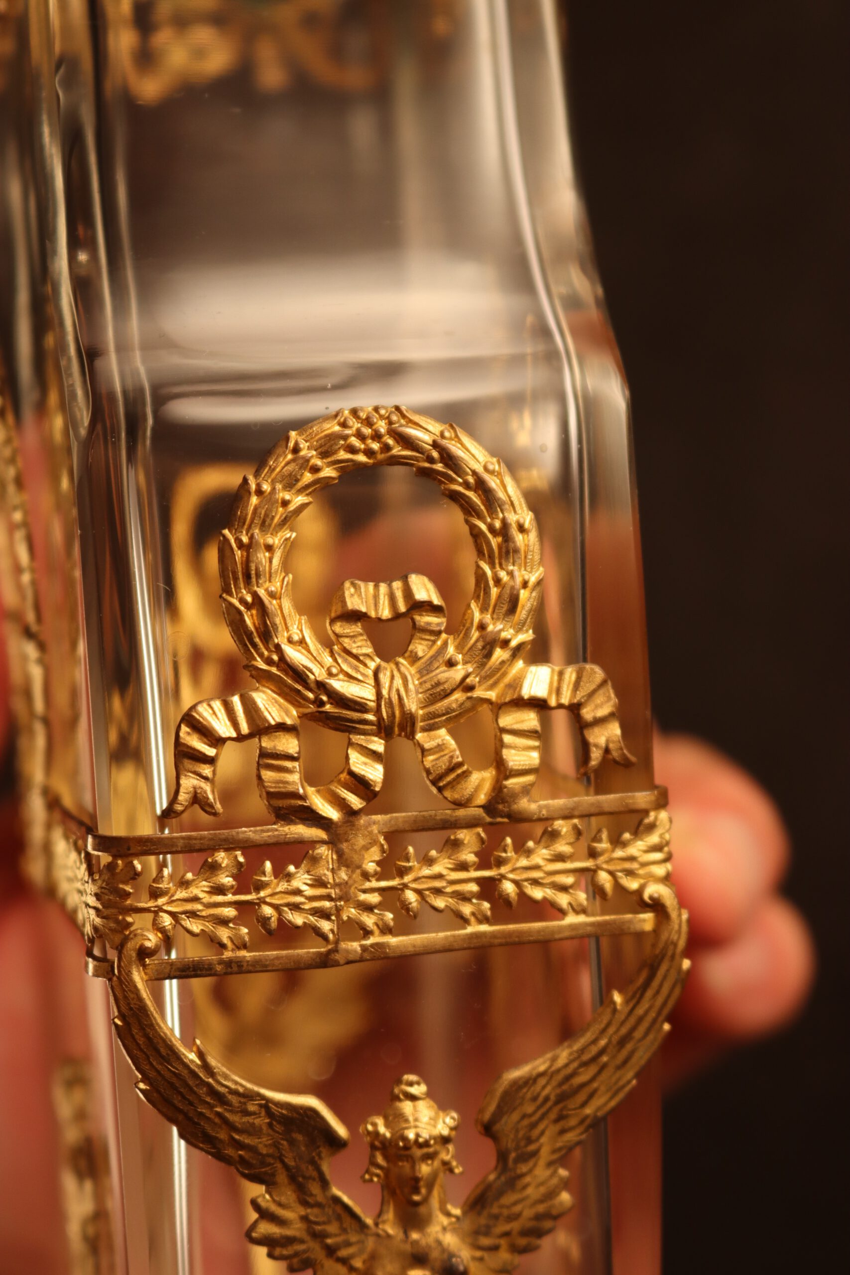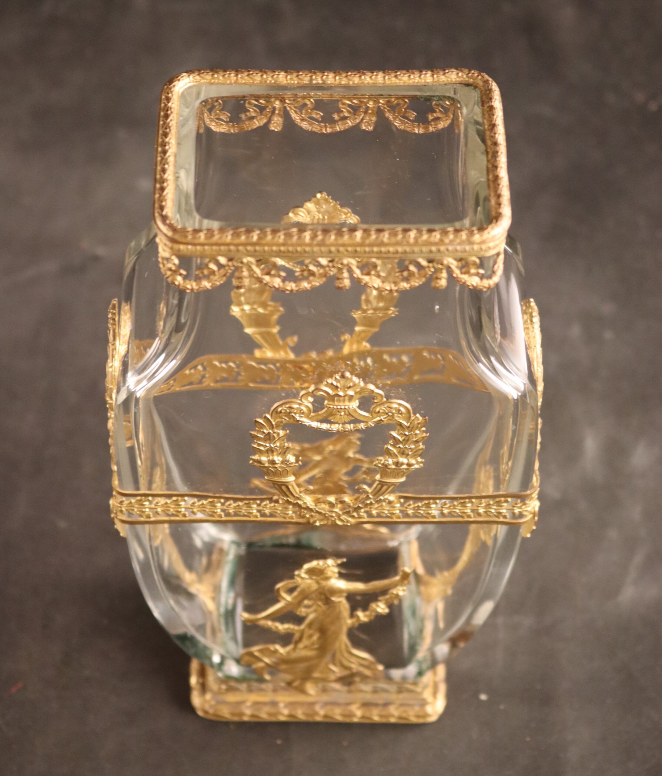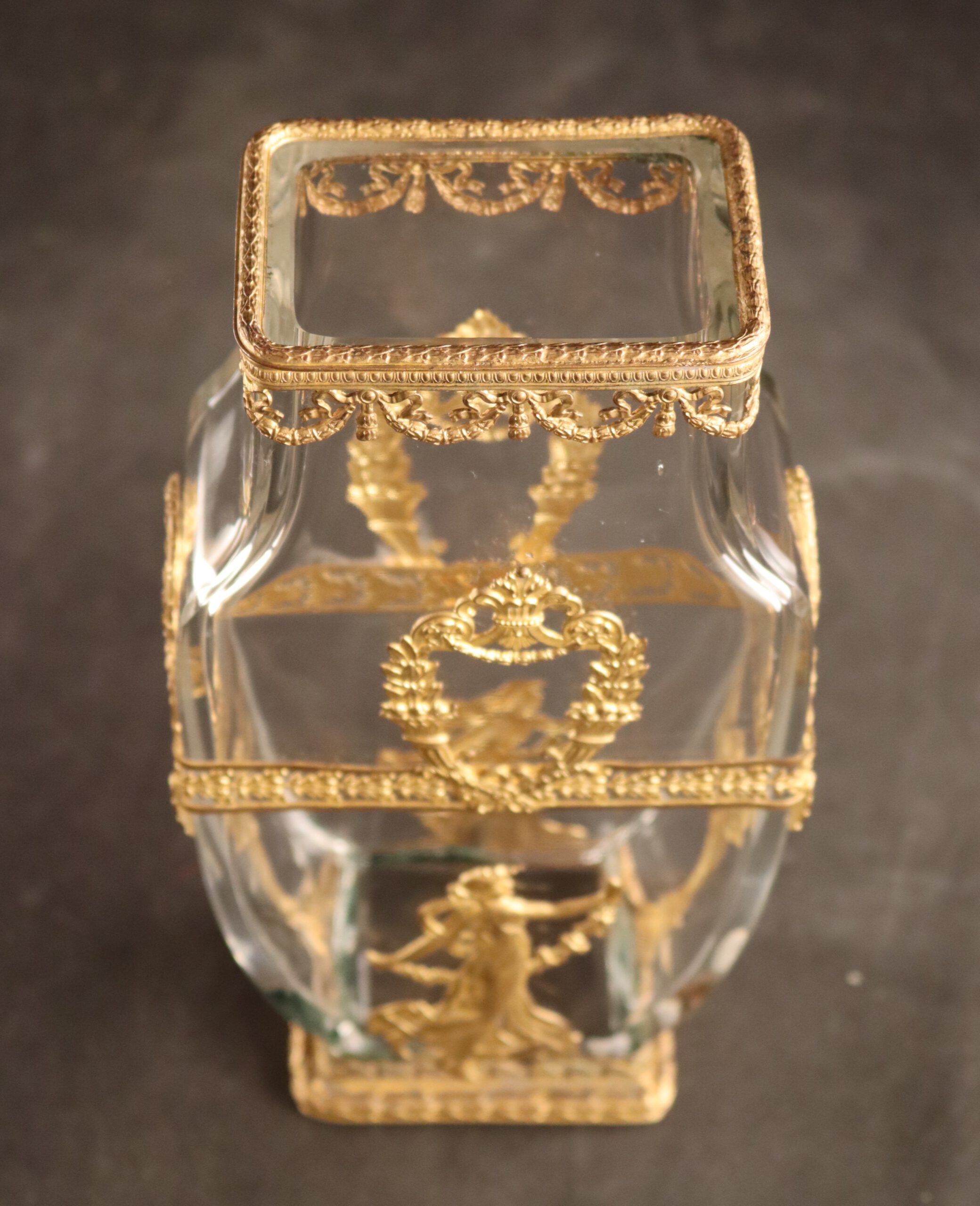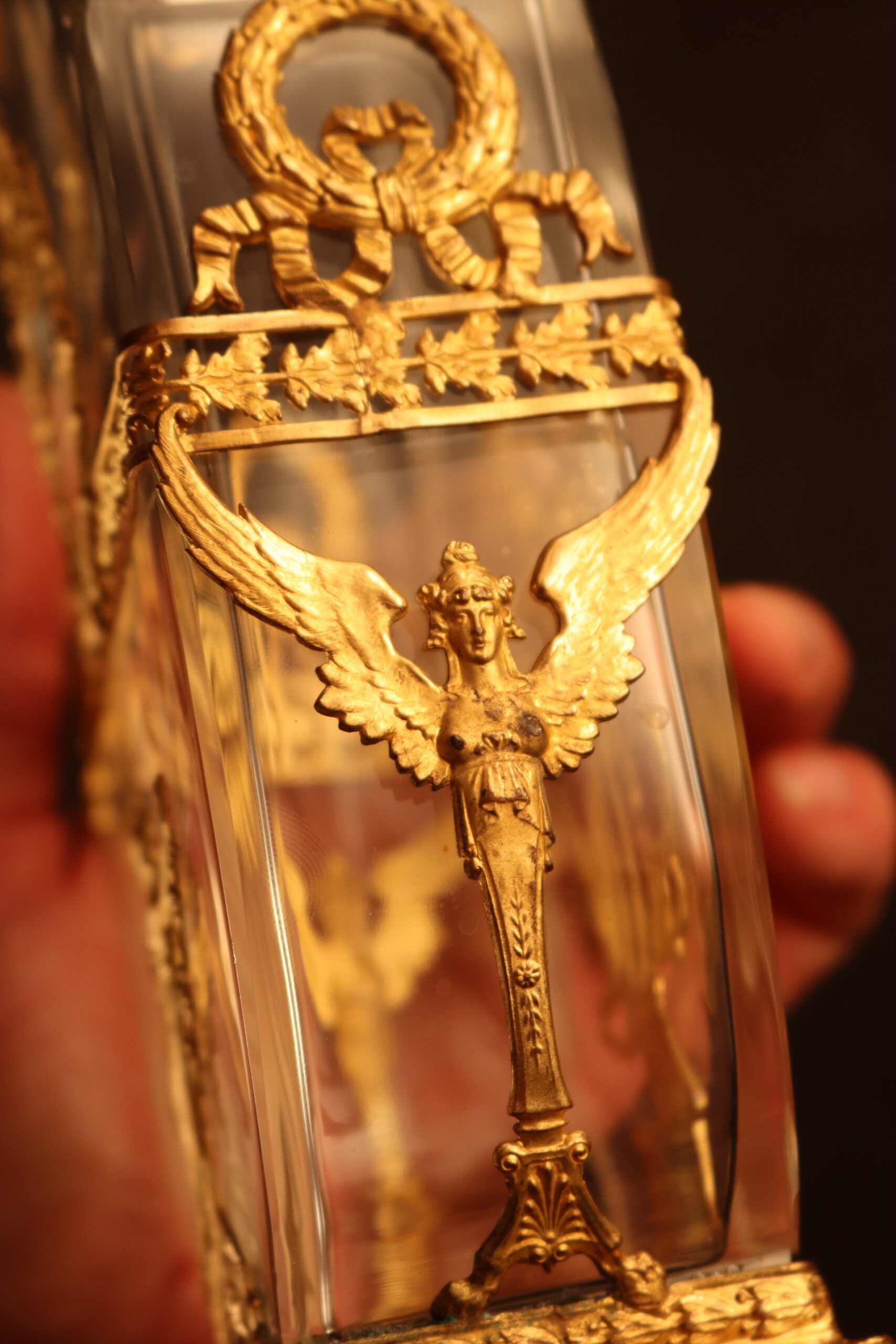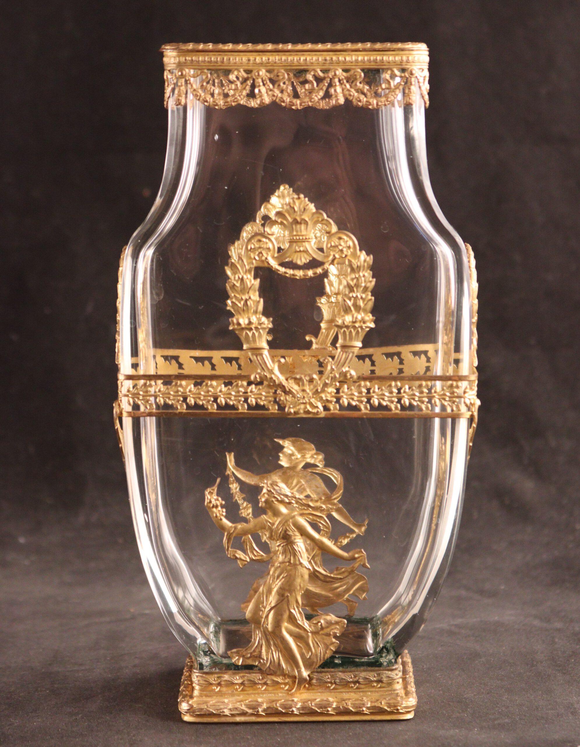 Zeer fraaie antieke kristallen Empire vaas die gevat zit een verguld bronzen montuur met versieringen en figuren uit de klassieke oudheid.