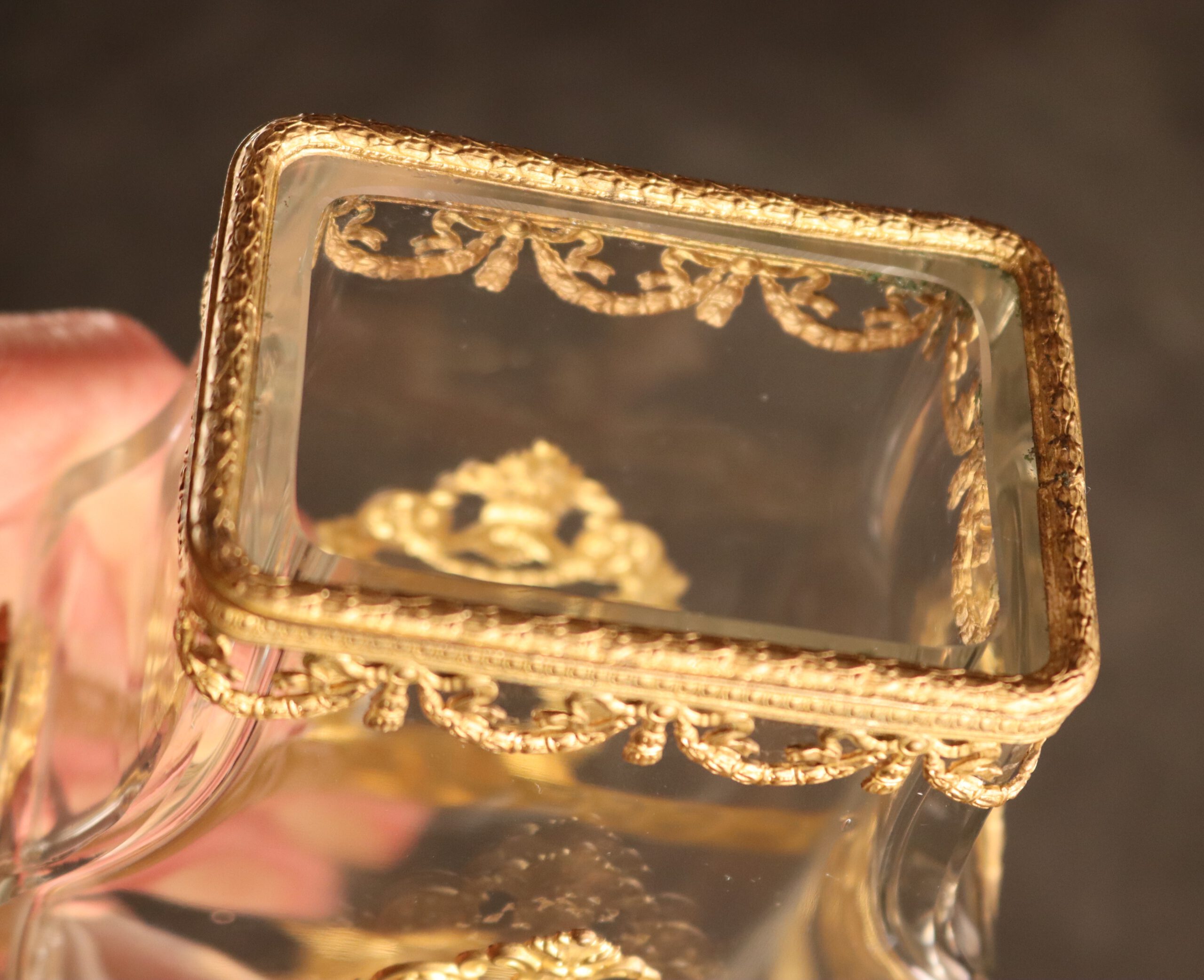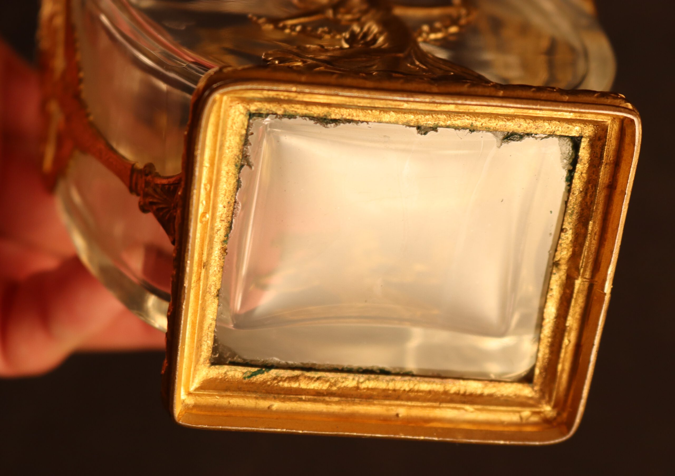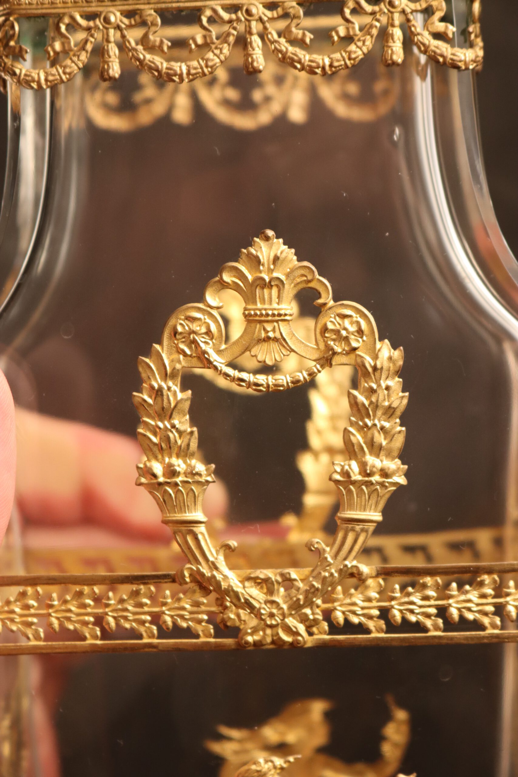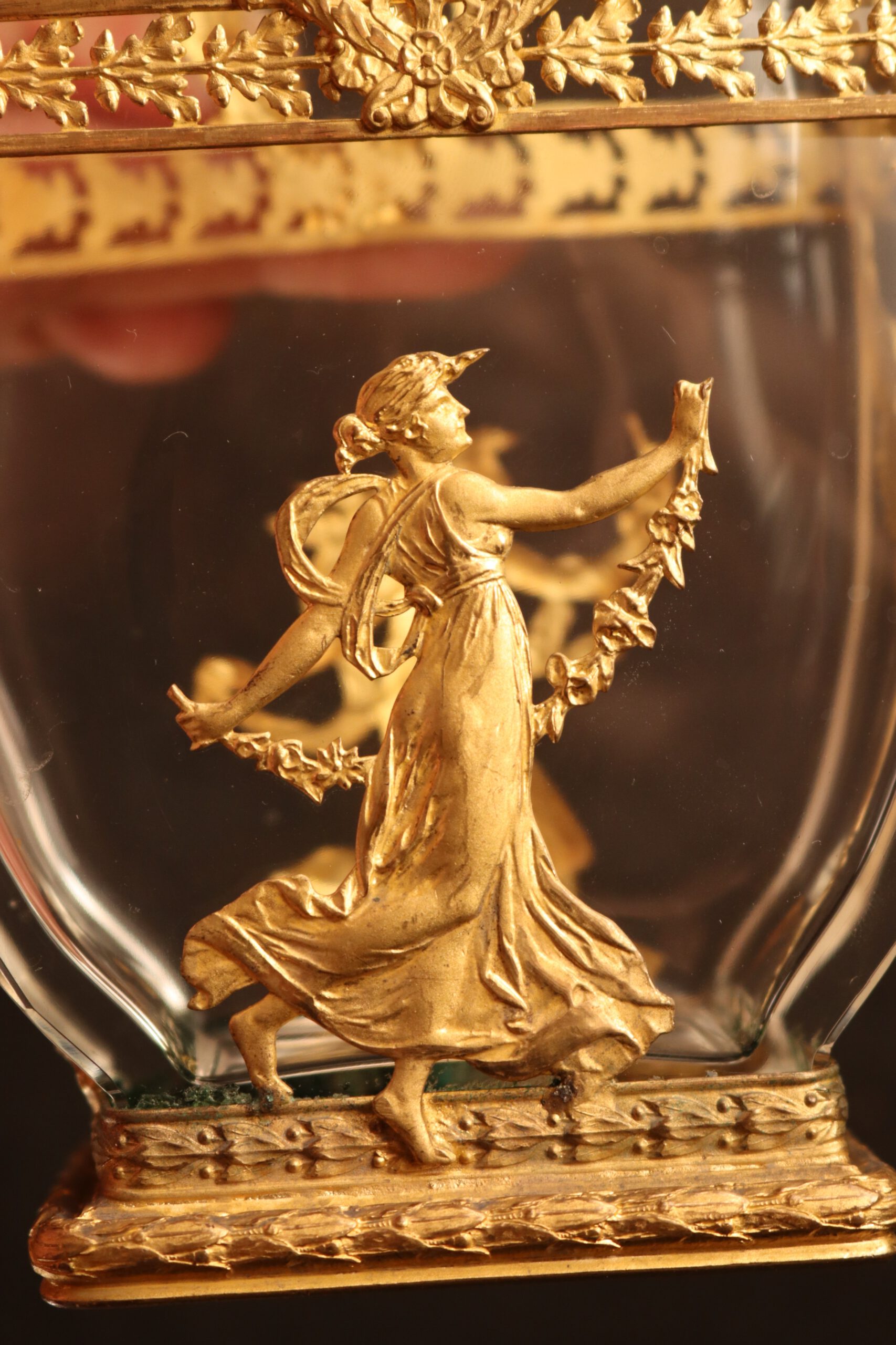 Zeer fraaie antieke kristallen Empire vaas die gevat zit een verguld bronzen montuur met versieringen en figuren uit de klassieke oudheid.