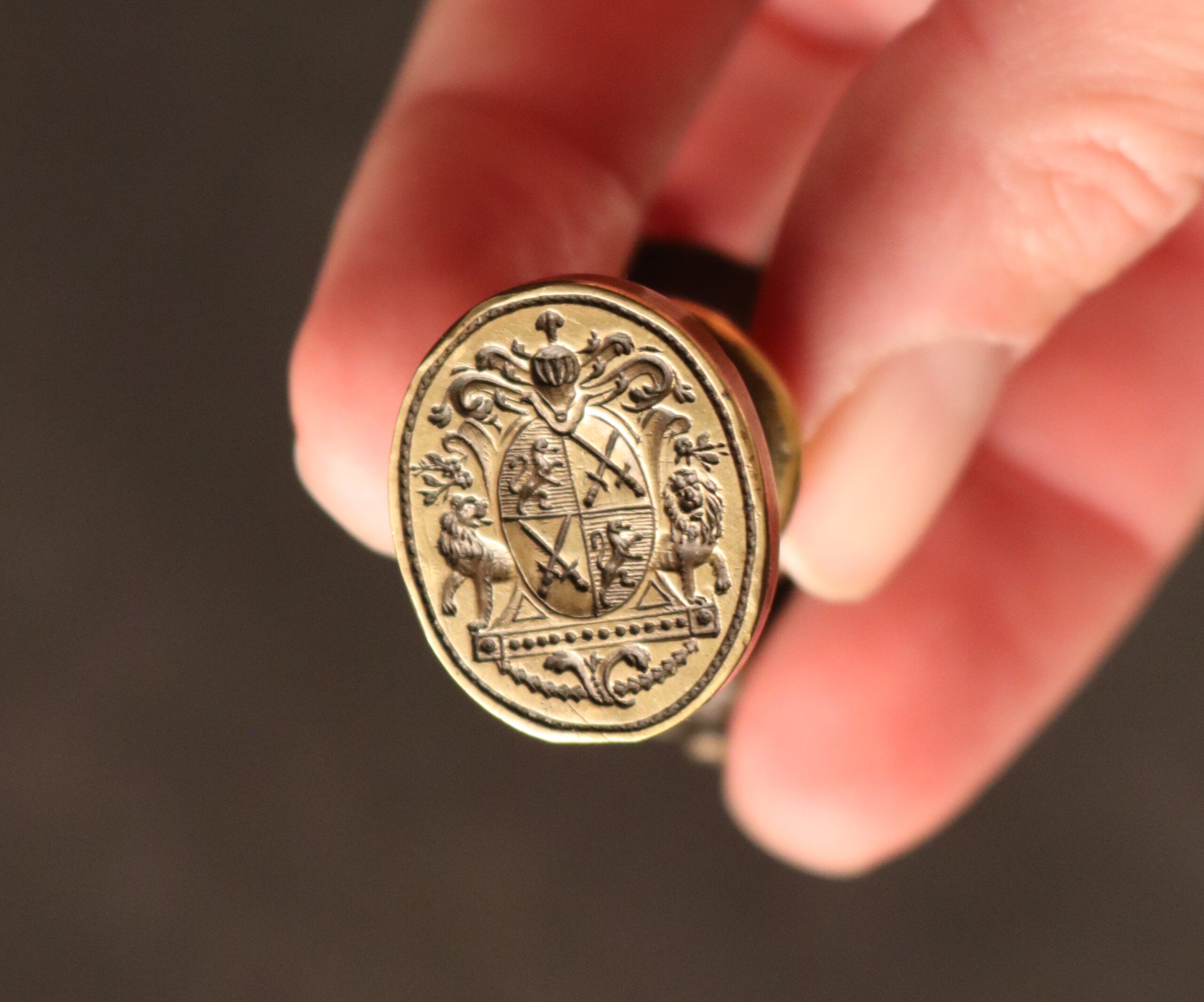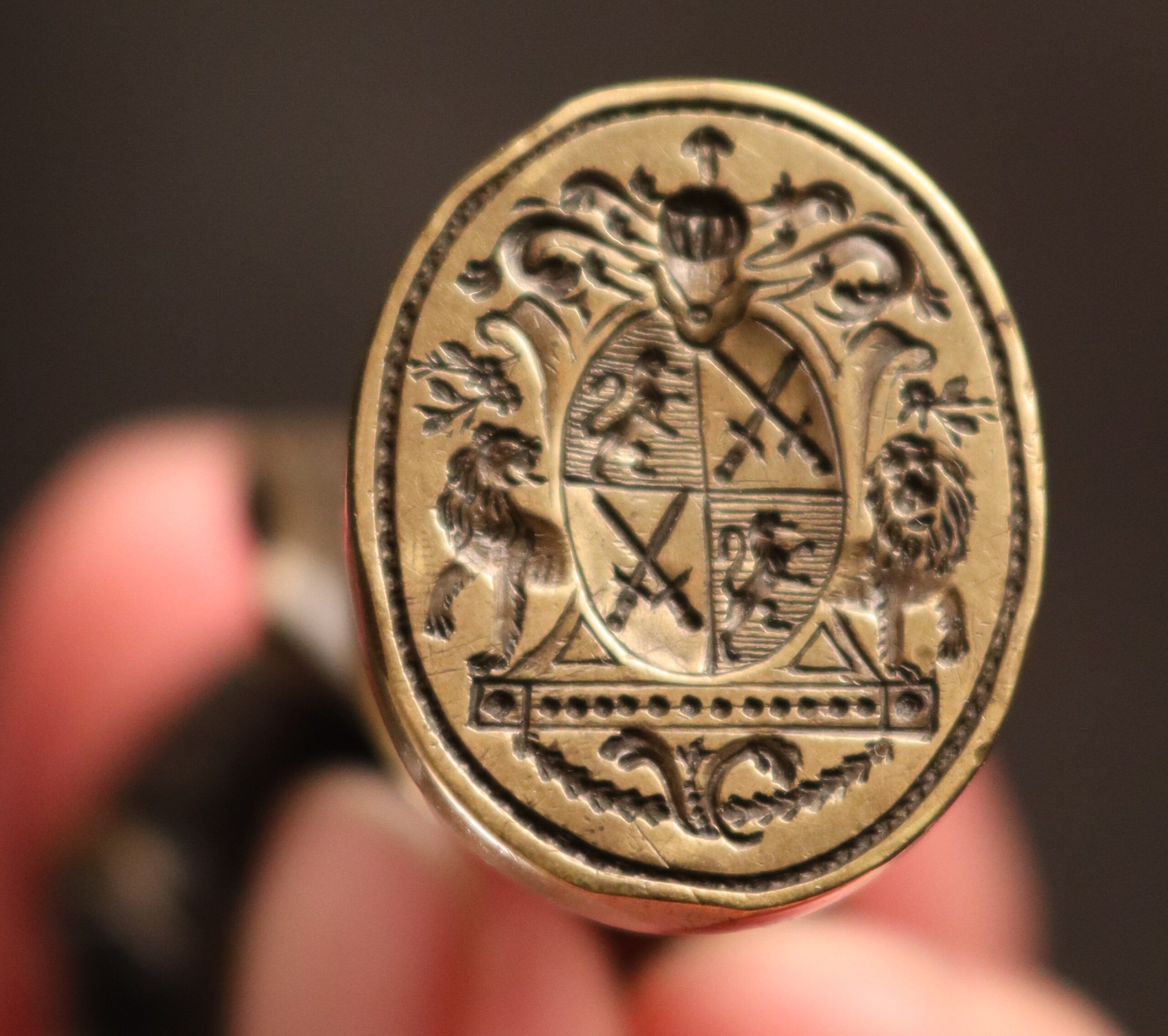 Heeft aan de onderzijde een familiewapen met ridderdecor.