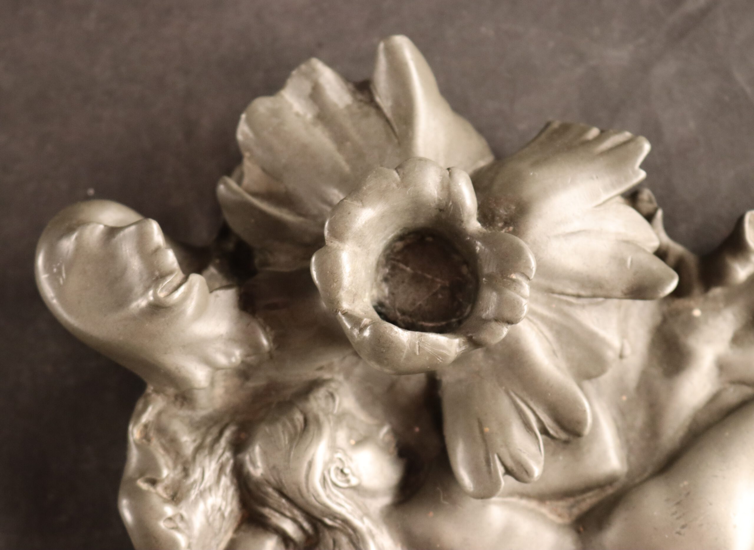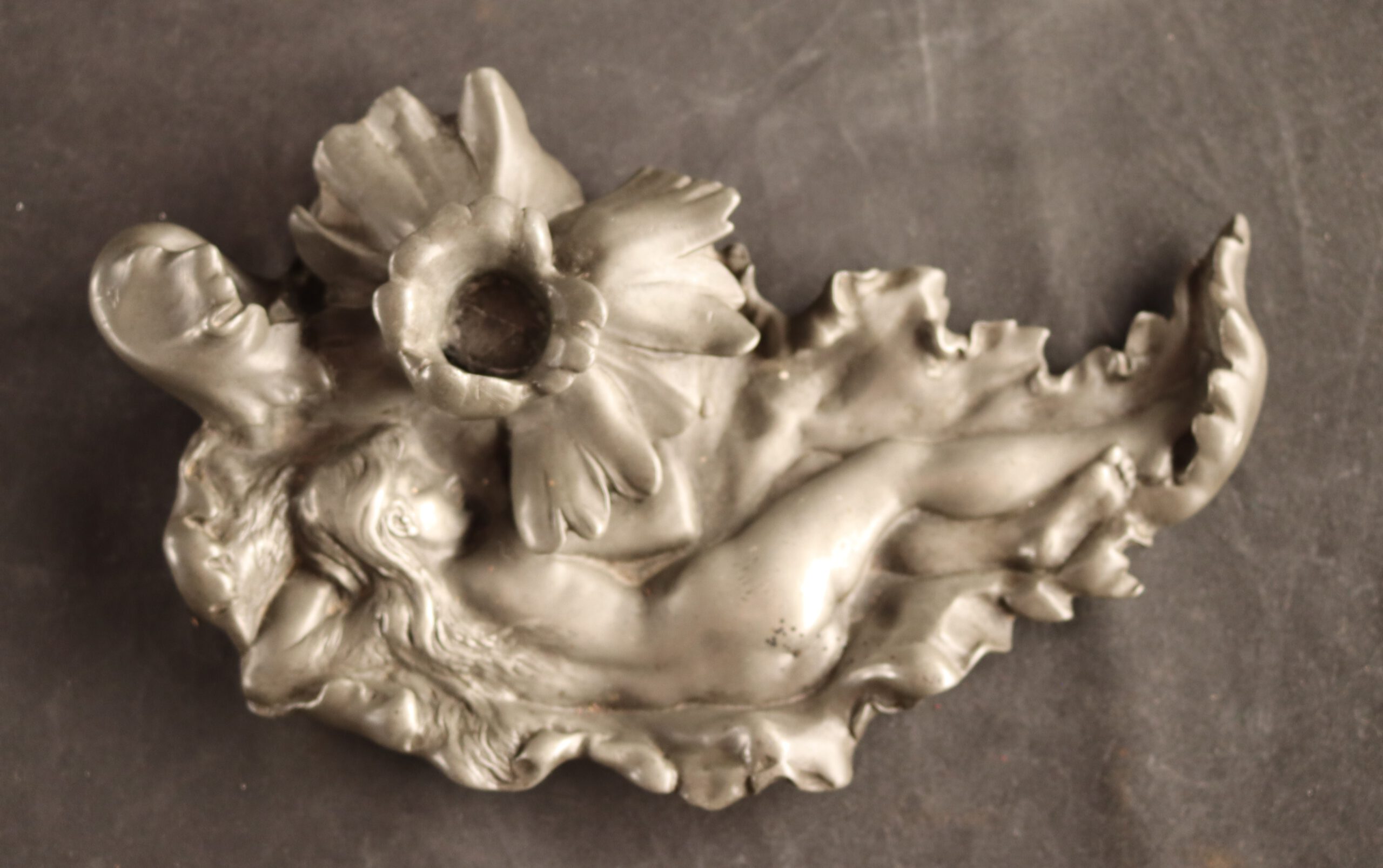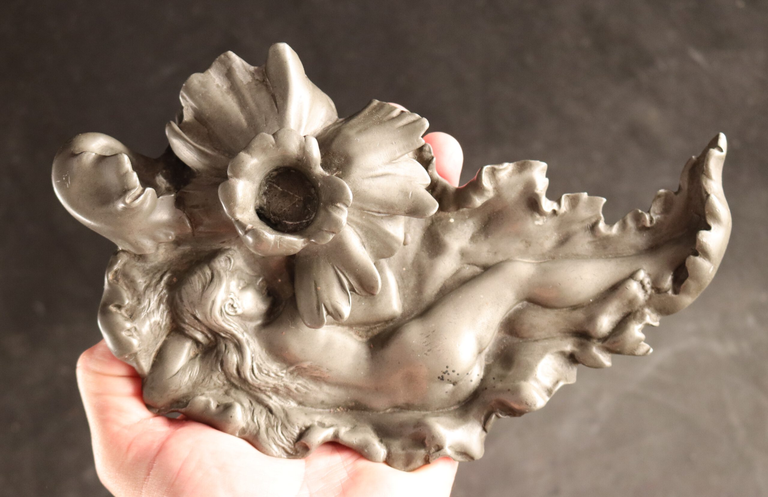 Fraaie antieke tinnen Art Nouveau kandelaar met liggend naakt.