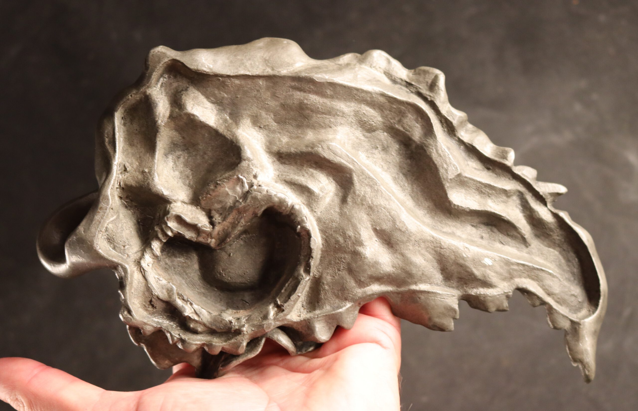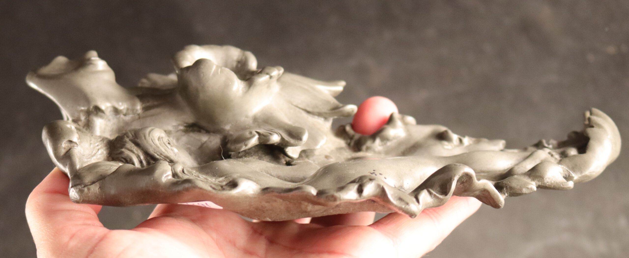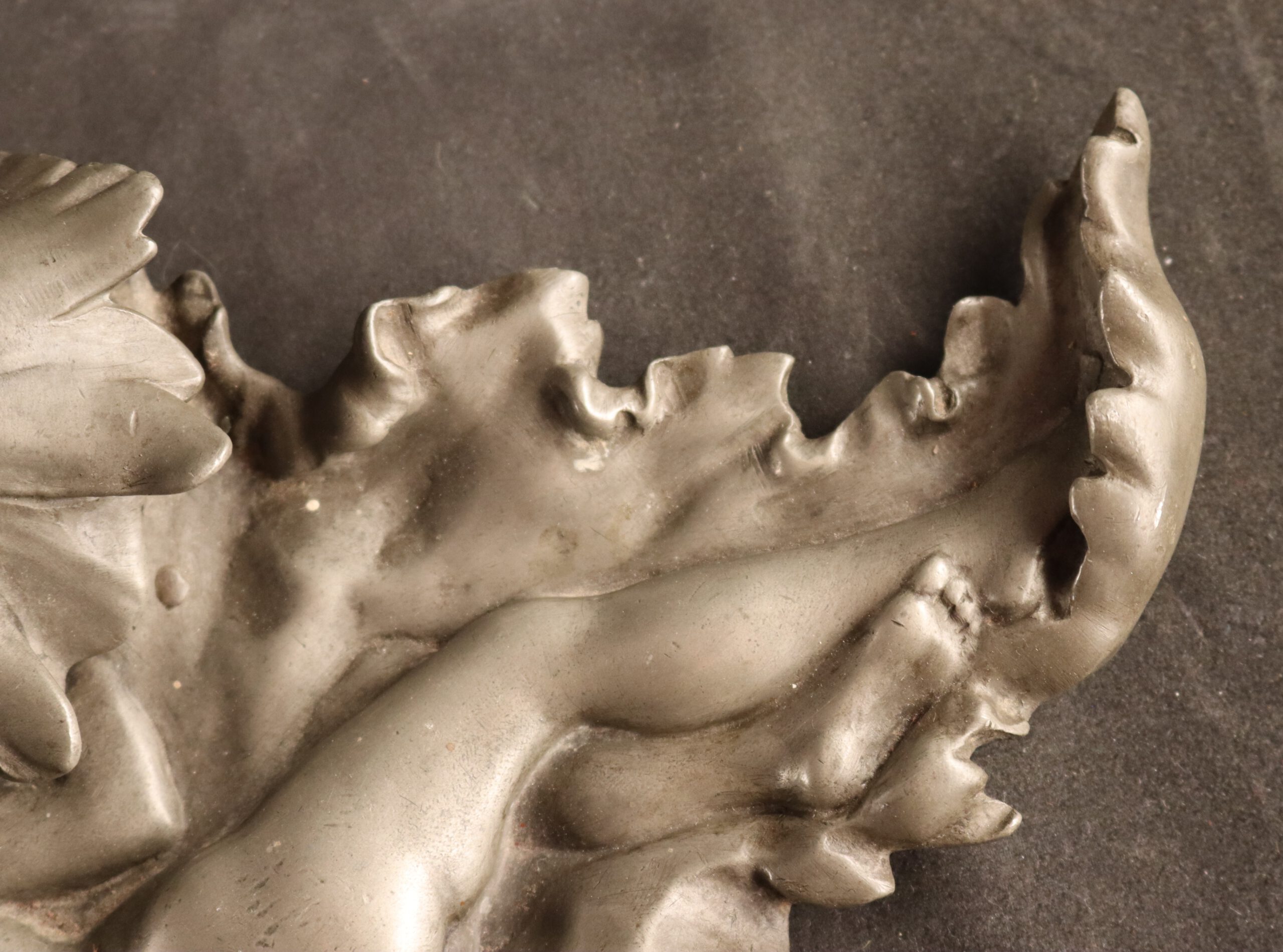 Fraaie antieke tinnen Art Nouveau kandelaar met liggend naakt.