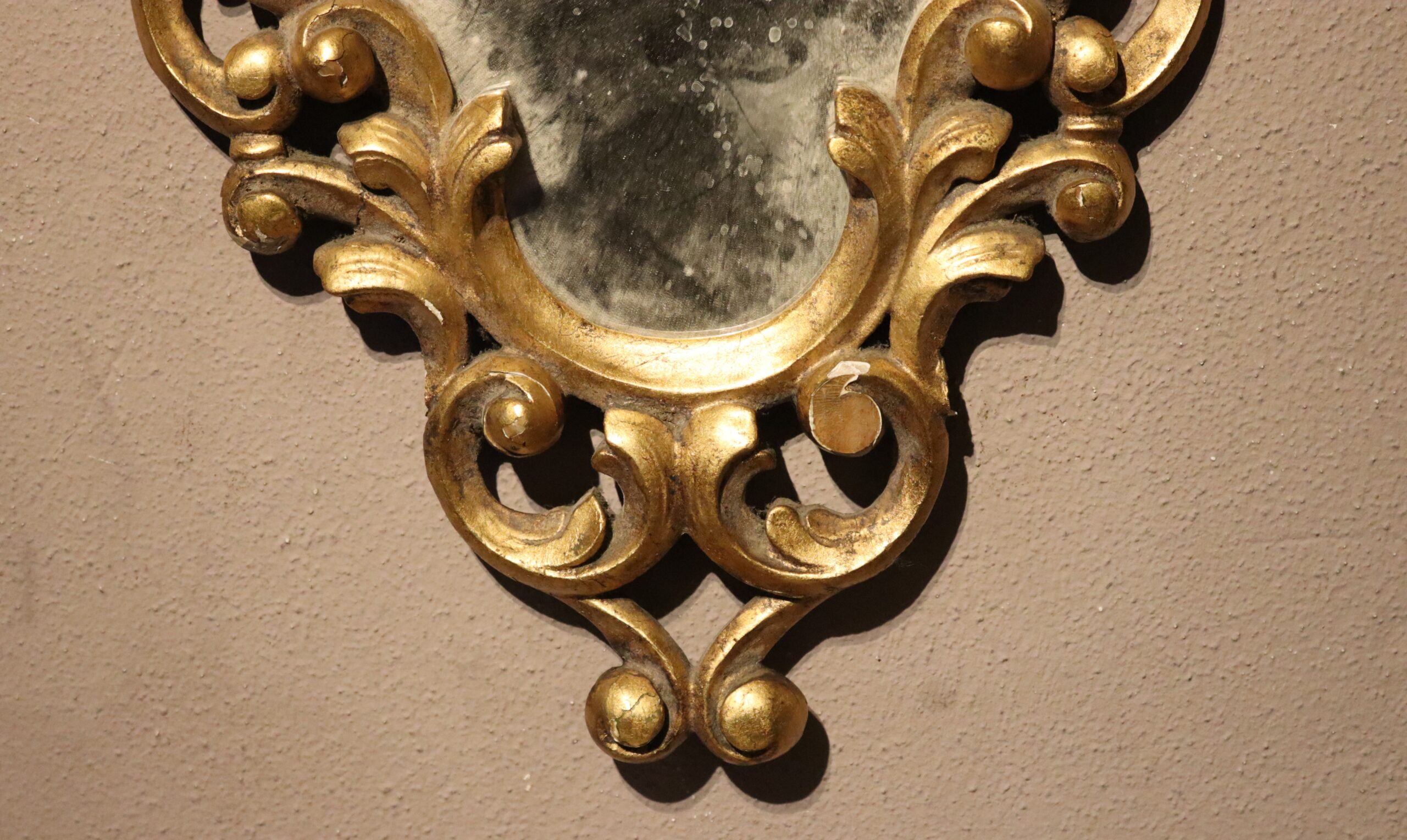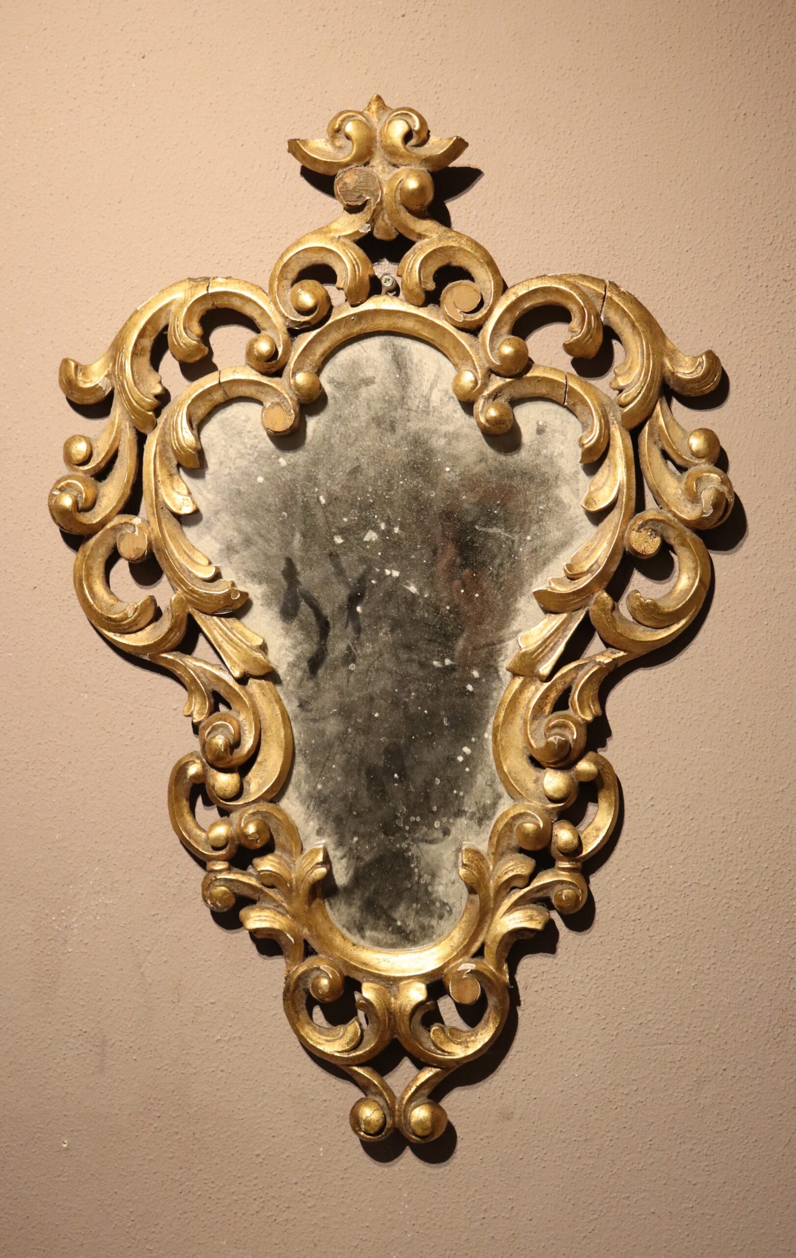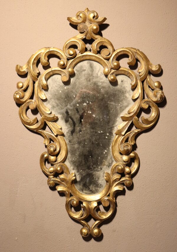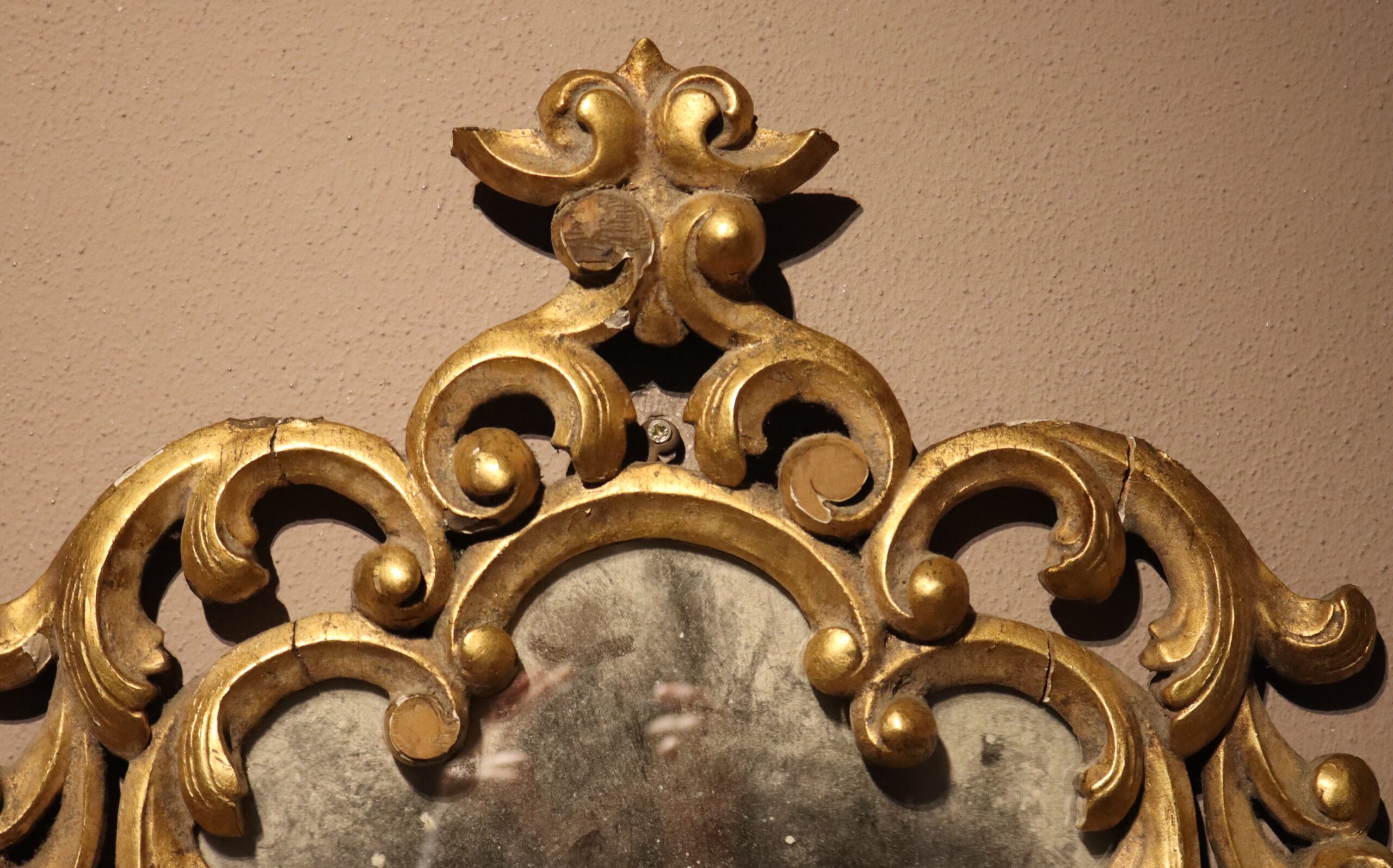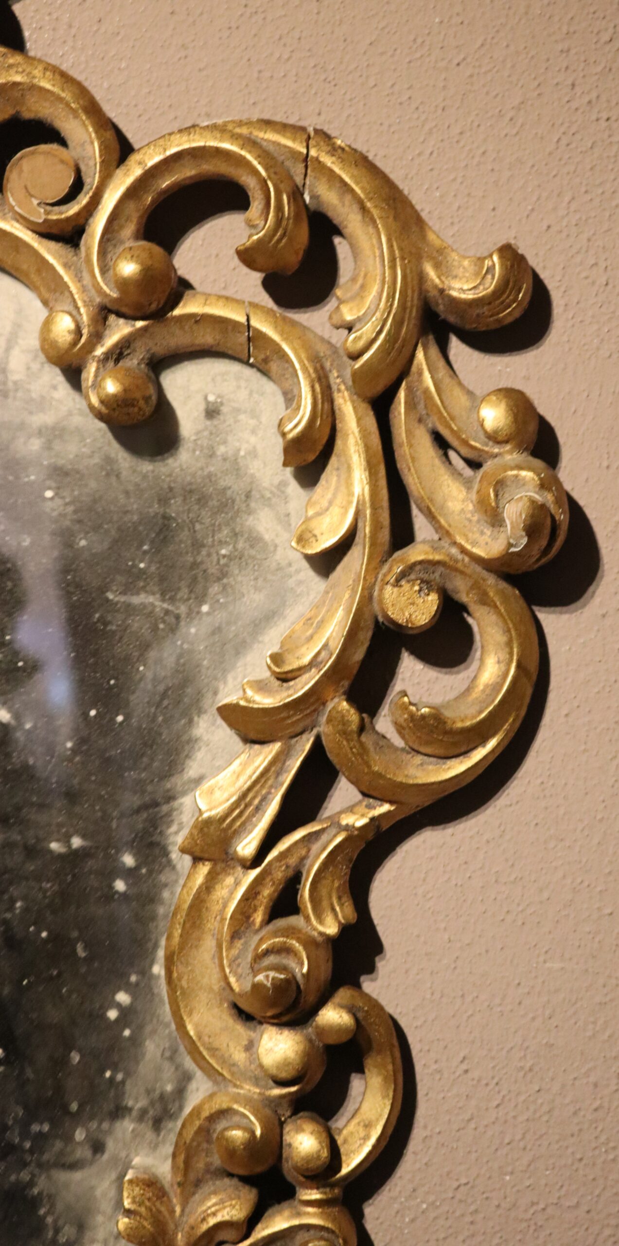 Bijzonder fraaie grote antieke vergulde en uit hout gestoken spiegel.