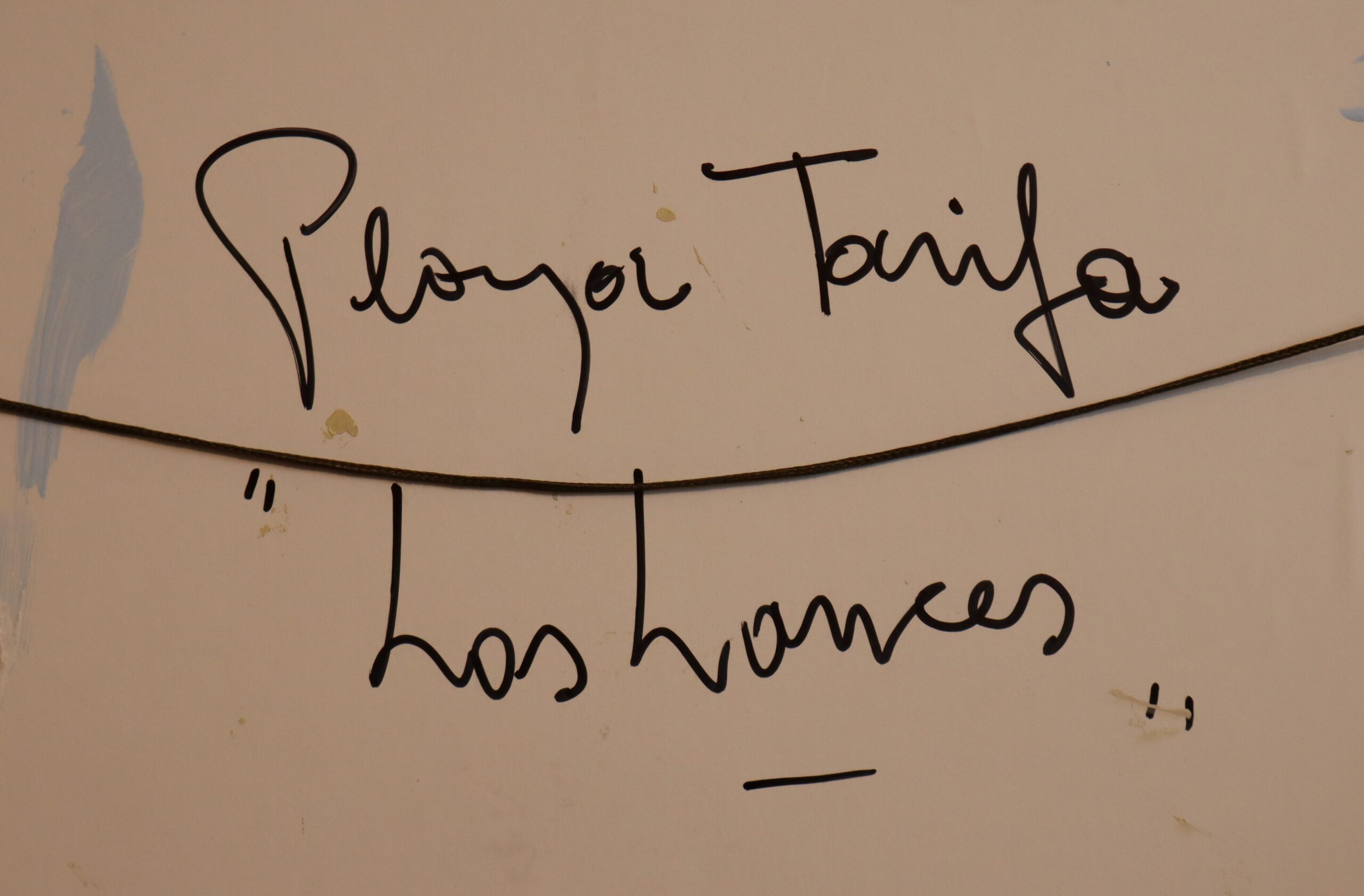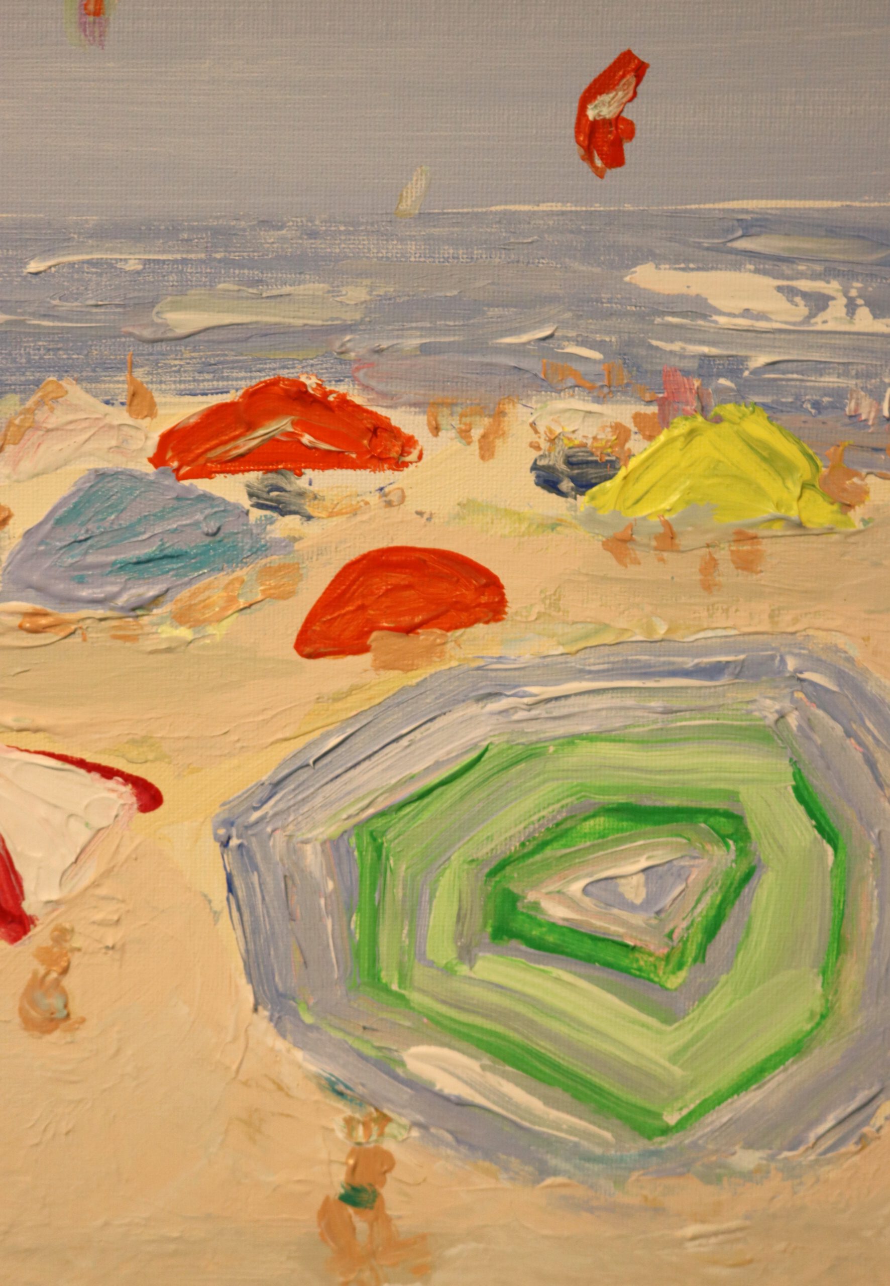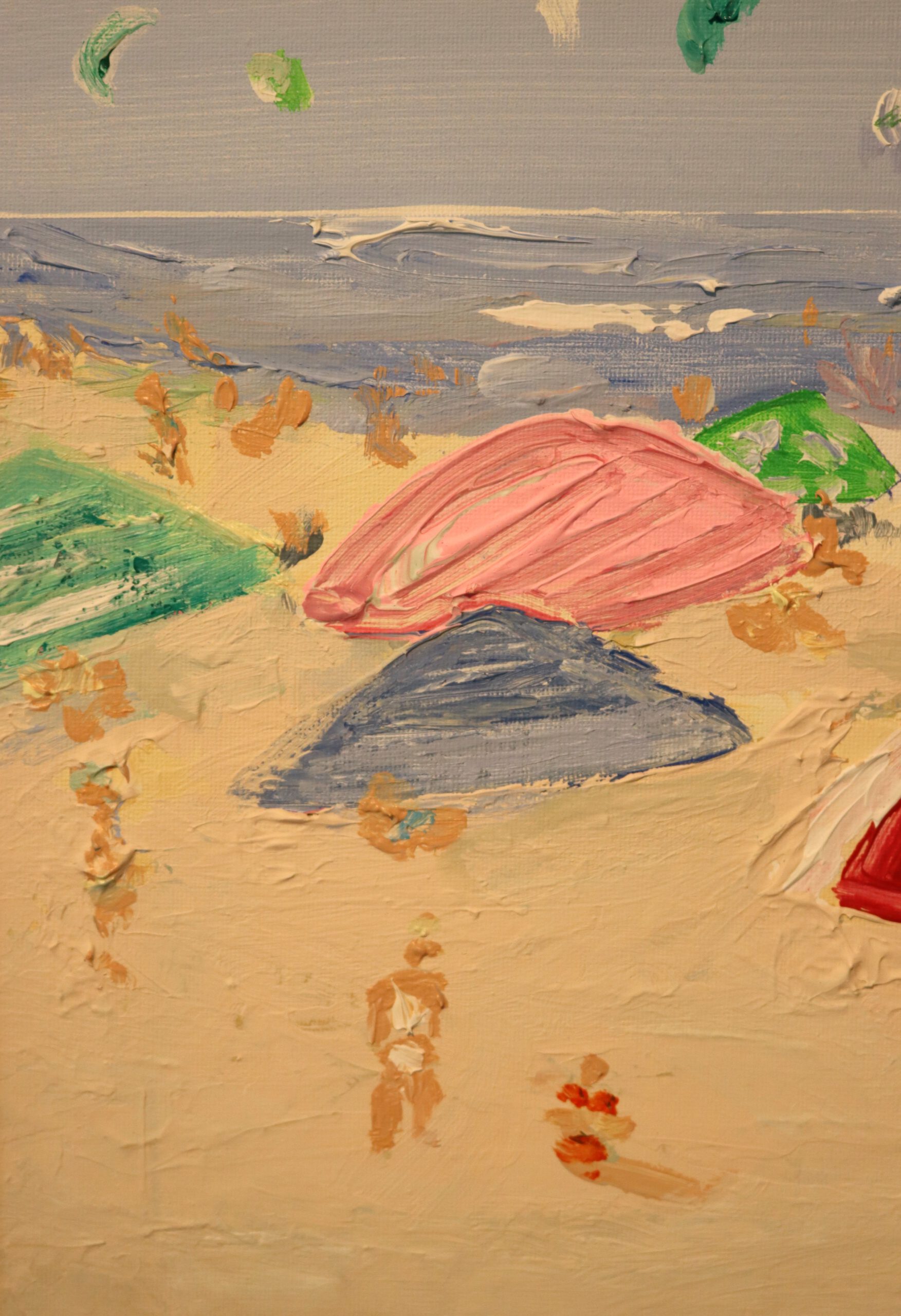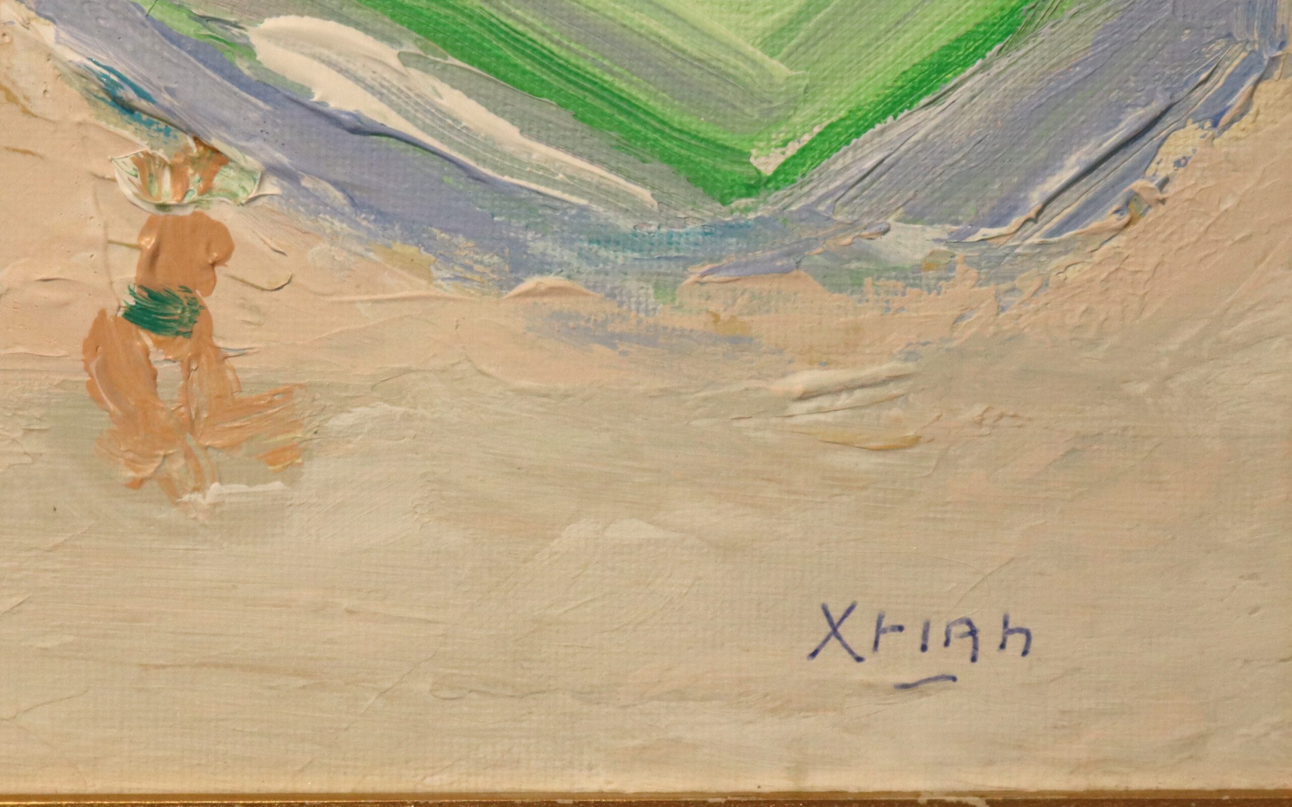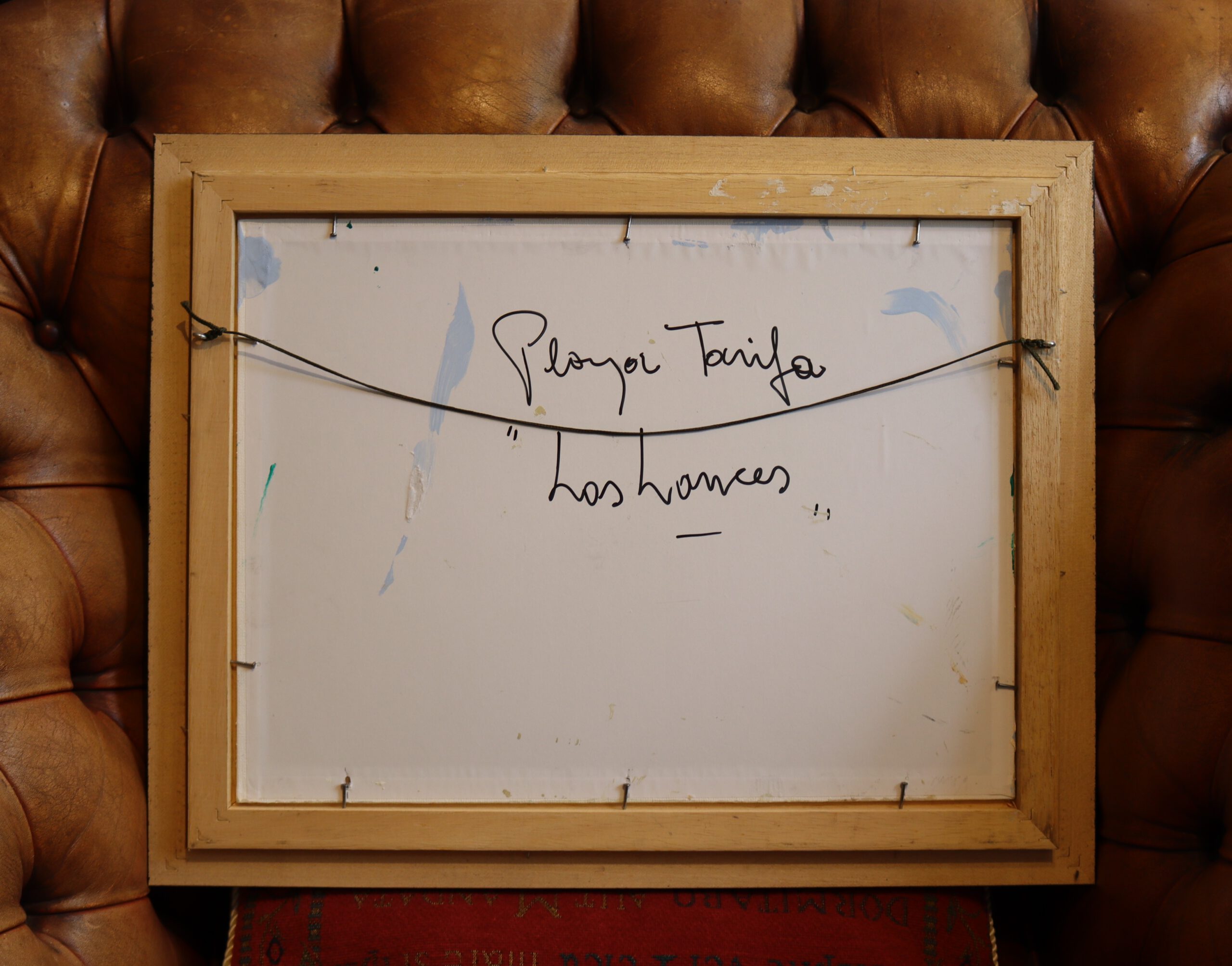 Fraai werk in olieverf op schildersboard voorstellende een kleurrijk Spaans strandzicht.