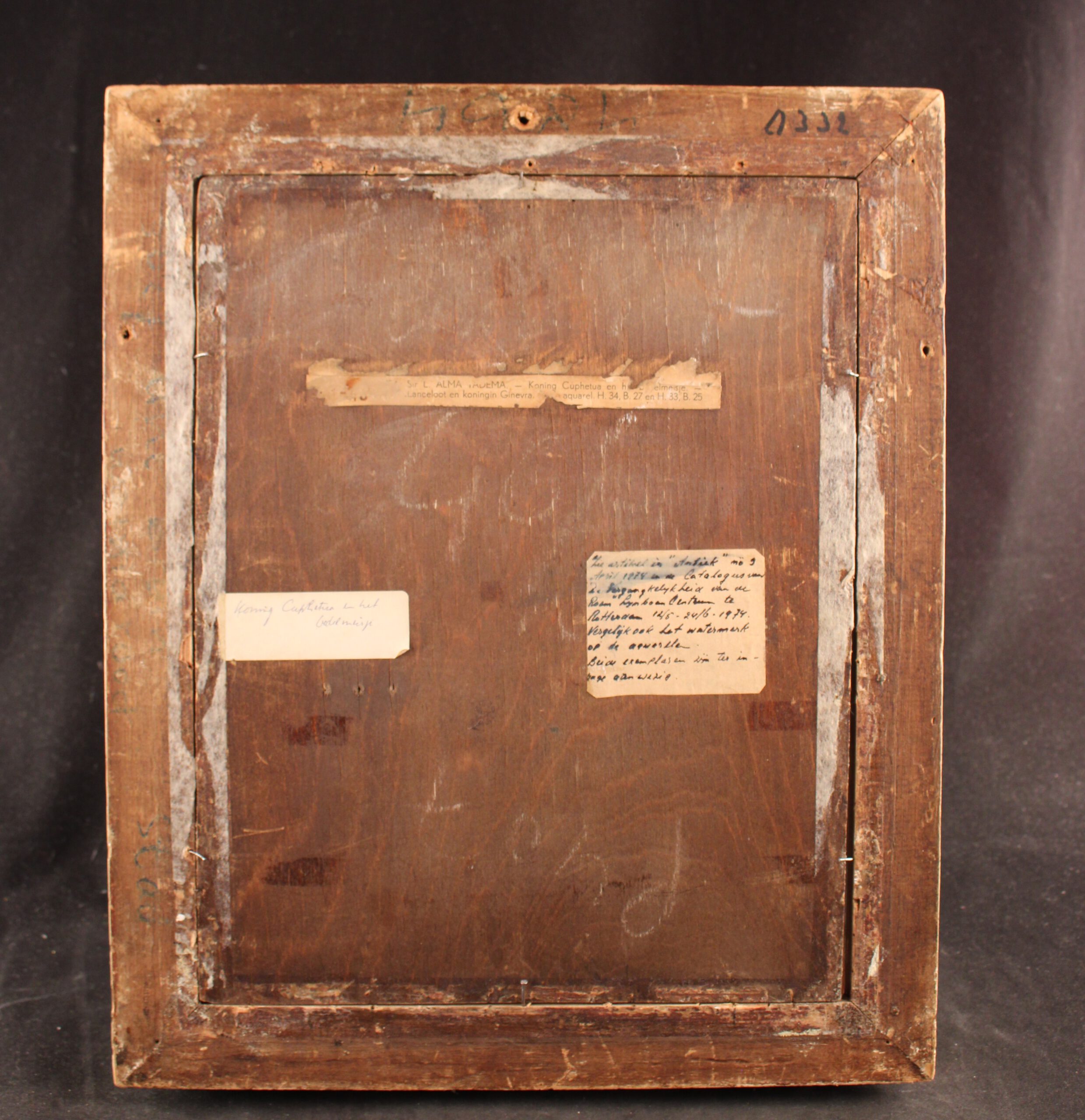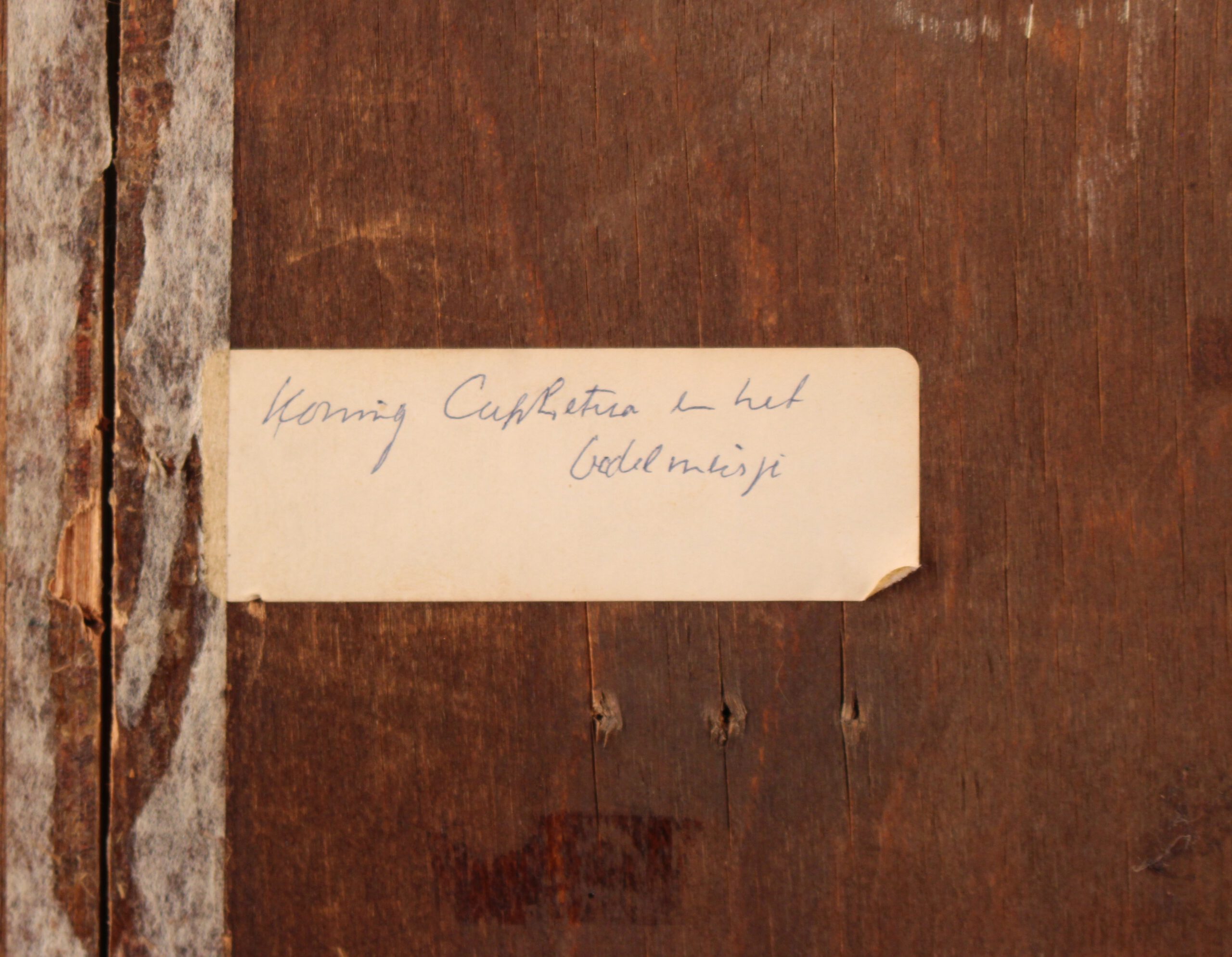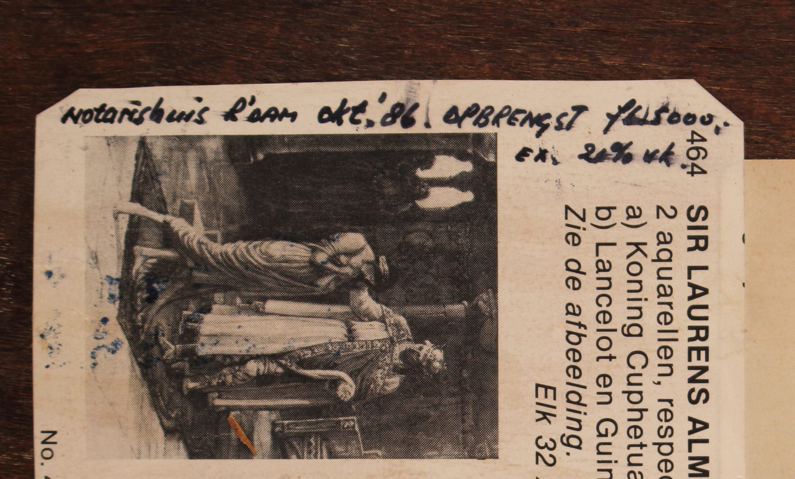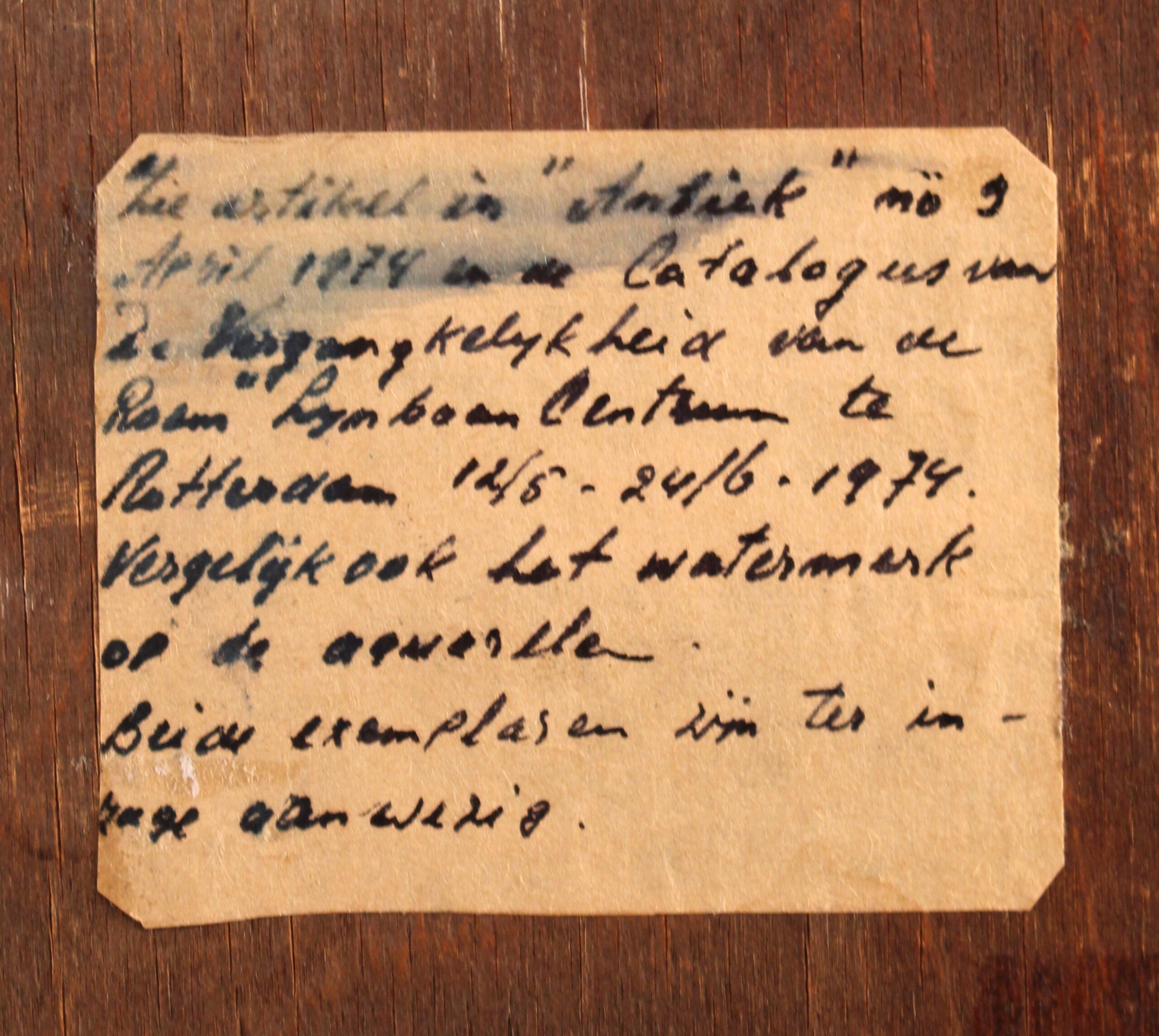 Er staat een volledige provenance op de achterzijde: zijn in 1984 onder andere geveild bij het notarishuis Rotterdam voor 15.000 Gulden exclusief veilingkosten.